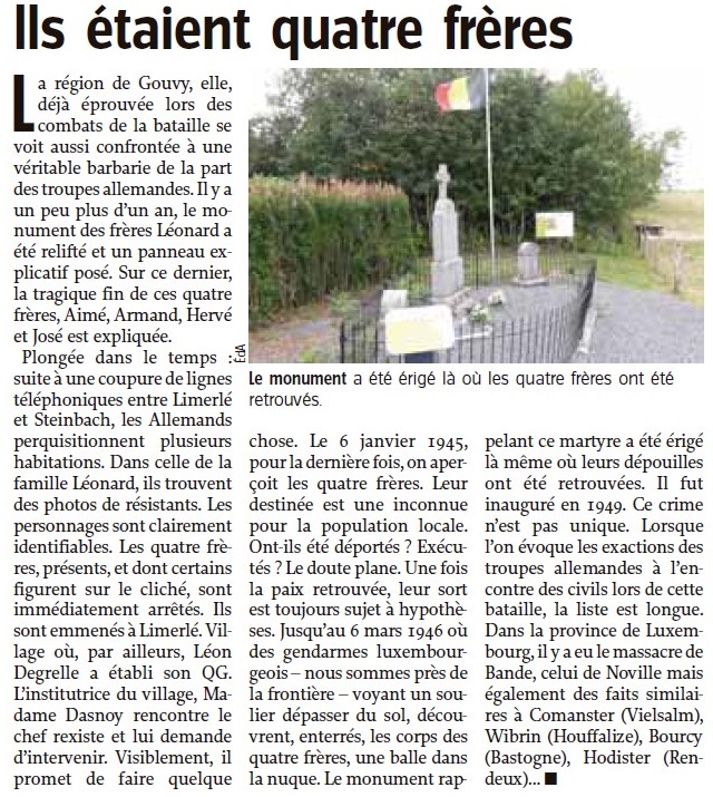 Localisation: À proximité de la frontière luxembourgeoise, Rue de la Grotte, à l'orée d'un petit bois de sapins, à l'endroit même où l'on retrouva leurs corps Coordonnées GPS: +50°10'06.24", +5°57'42.44" Inscriptions Sur la pierre de gauche "JEUNES HÉROS" Sur la pierre centrale "PASSANT SOUVIENS-TOI QU'ICI FURENT LÂCHEMENT ASSASSINÉS PAR LES ALLEMANDS EN JANVIER 1945 LES QUATRE FRÈRES LÉONARD AMAND HERVÉ AIMÉ JOSÉ" Sur la pierre de droite "ACCUEILLEZ NOS AVE" Informations complémentaires: C'est à l'orée d'un petit bois de sapins qu'un monument commémoratif a été dressé à l'endroit même où l'on retrouva les corps des frères Léonard, quatre jeunes résistants exécutés, sur ordre du dirigeant fasciste Léon Degrelle, à la fin de la seconde guerre mondiale (Source: Geocaching) Remarque: à noter la faute d'orthographe sur la pierre de droite où l'on a écrit "acceuillez" au lieu de "accueillez" ! Plus d'informations concernant ces personnes |