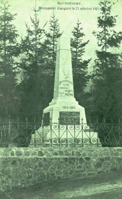 Localisation: À l’intersection de la rue de la Grotte et de la rue du Monument. Coordonnées GPS: +49° 34' 52.50", +5° 45' 37.50" Inscriptions Face avant "BATTINCOURT À SES ENFANTS MORTS POUR LA PATRIE 1914 - 1918 [Quatre noms, avec indication de la date et du lieu de décès] 1940 - 1945 [Six noms, avec indication de la date et du lieu de décès]" Face latérale droite "COMBATTANTS 14-18 [Neuf noms, classés par ordre alphabétique]" Face latérale gauche "COMBATTANTS 14-18 [Dix noms, classés par ordre alphabétique]" Date d'inauguration: 23 octobre 1921 Voir les noms mentionnés sur ce monument |