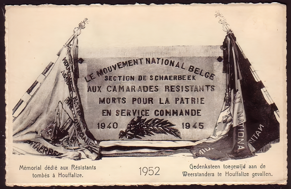 Localisation: Rue de Schaerbeek, sur la façade de l'école communale. Coordonnées GPS : +50°07'50.3", +5°47'23.2" Inscriptions "EN SOUVENIR DES RÉSISTANTS HOUFFALOIS PASSEURS 1940 - 1944 A.N.F.P.H.B. DON DU M.N.B. SCHAERBEEK" Monument original de 1952 (voir bas de page pour photo) "LE MOUVEMENT NATIONAL BELGE SECTION DE SCHAERBEEK AUX CAMARADES RÉSISTANTS MORTS POUR LA PATRIE EN SERVICE COMMANDÉ 1940 - 1945" Ce monument ne comporte pas de noms |