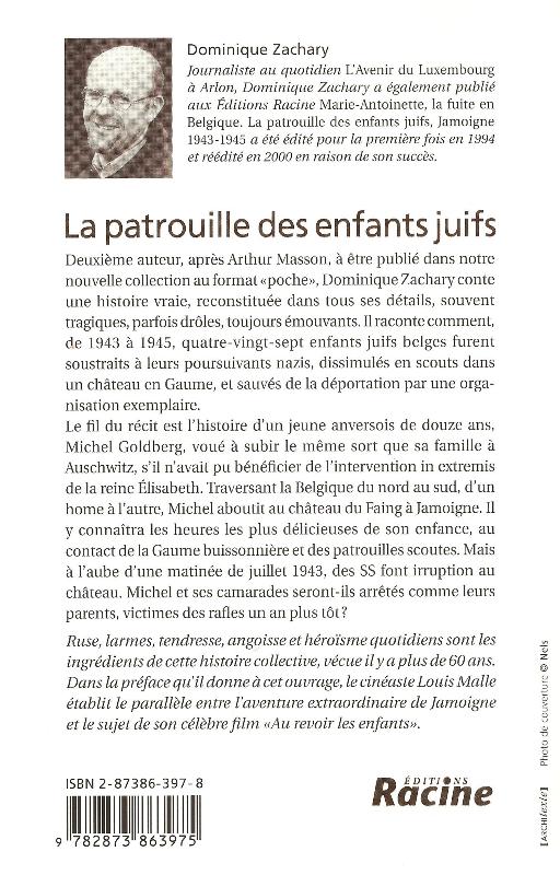 Localisation: Château du Faing, rue du Faing, siège de l'administration communale de l'entité de Chiny. Coordonnées GPS: +49°41'40.35", +5°24'40.23" Inscriptions "EN 1943 ET 1944 DANS CE CHÂTEAU, 83 ENFANTS JUIFS ACCUEILLIS ET PROTÉGÉS, FURENT SOUSTRAITS AUX PLANS D'EXTERMINATION DE L'ALLEMAGNE NAZIE. TÉMOIGNAGE D'INFINIE RECONNAISSANCE, CETTE PLAQUE RAPPELLE LE DÉVOUEMENT ET LE COURAGE DES MEMBRES DU COMITÉ ORGANISATEUR, DE LA DIRECTION ET DU PERSONNEL DU HOME REINE ELISABETH, QUI ONT SAUVÉ CES ENFANTS AU PÉRIL DE LEUR VIE." Inauguration: 1988 (Source : "La patrouille des enfants juifs", Dominique ZACHARY). À l'origine, la plaque était apposée sur un mur du château. Informations complémentaires Le journaliste arlonais Dominique ZACHARY a publié aux éditions Racine un ouvrage intitulé "La Patrouille des enfants juifs" (voir pages de couverture ci-dessous) et qui relate l'histoire de ces enfants hébergés au château du Faing. Cet ouvrage a fait l'objet de plusieurs rééditions (voir ci-dessous). Le dessinateur ardennais de bandes dessinées Jean-Claude SERVAIS a lui créé une bande dessinée qui s'inspire (très) librement de cette histoire. Cette bande dessinée en deux tomes s'appelle "La lettre froissée". Les promenades des enfants juifs : Parcourez les trois promenades pédestres qui vous conduiront sur les traces des enfants juifs cachés au home Elisabeth à Jamoigne (Source : Syndicat d'initiative de Jamoigne). Cette plaque ne comporte pas de noms |