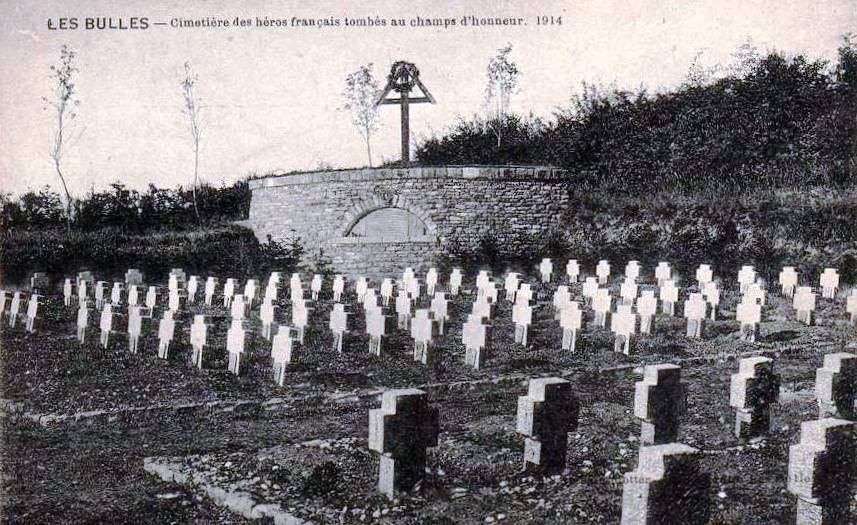 Localisation: Ce cimetière était situé rue de la Chevrette, en face du monument au lieutenant de Crépy (Source: Mme REMACLE-ROGIER). Informations complémentaires Les corps inhumés au départ à Les Bulles en 1914 ont été transférés dans l'ossuaire du cimetière du Plateau à Rossignol en 1923 (Source: Site "1914-1918. Première Guerre Mondiale"). Sur le plan ci-dessous, on distingue 120 tombes. La liste des soldats inhumés dans ce cimetière ne nous est pas connue. |