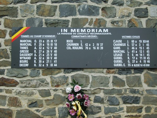 Localisation de ce monument: À l'église. Coordonnées GPS: 50° 01' 30" N, 5° 50' 09" E. Inscription figurant sur ce monument "IN MEMORIAM LA PAROISSE DE LONGVILLY RECONNAISSANTE TOMBÉS AU CHAMP D'HONNEUR [Huit noms] COMBATTANTS DÉCÉDÉS [Trois noms] VICTIMES CIVILES [Huit noms]" Voir les noms mentionnés sur ce monument |