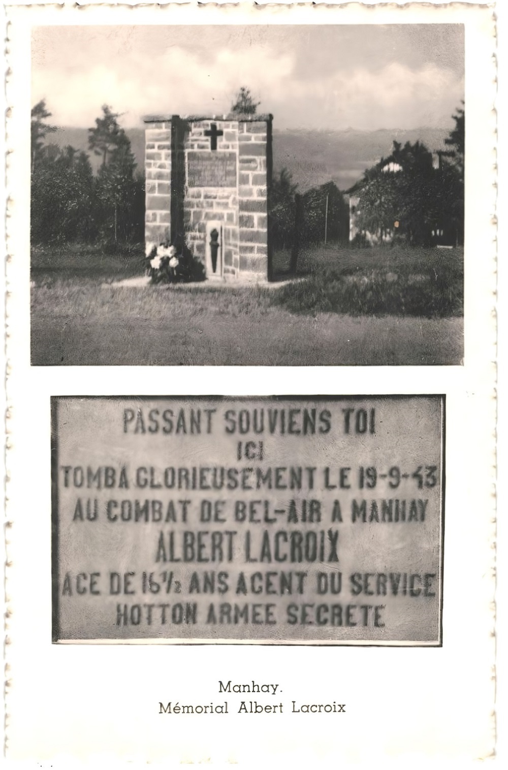 Localisation: Bellaire (Nationale 30 Manhay - Baraque de Fraiture; sur la gauche après environ 1,5 km en sortant de Manhay). Coordonnées GPS: +50°17'09.87", +5°41'30.99" Inscriptions "PASSANT SOUVIENS-TOI ICI TOMBA GLORIEUSEMENT LE 19-9-43 AU COMBAT DE BEL-AIR À MANHAY ALBERT LACROIX ÂGÉ DE 16 1/2 ANS AGENT DU SERVICE HOTTON ARMÉE SECRÈTE". Au pied du monument, on trouve une petite plaque en marbre portant l'inscription suivante: "UNE PENSÉE CHAQUE JOUR À NOS CAMARADES DE COMBAT. JEAN STINE ET MARIA COURTOIS" Plus d'informations concernant Albert LACROIX |