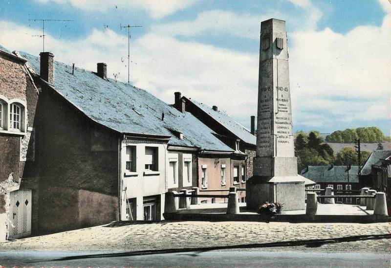 Localisation: Rue d'Arlon, à son intersection avec la rue Neuve. Coordonnées GPS: +49°35'37.02", +5°48'53.05" Inscriptions Sur une des faces "1940-45 À NOS HÉROS TOMBÉS AU CHAMP D'HONNEUR [Six noms, classés par ordre alphabétique]" Sur la deuxième face "1914-18 À NOS HÉROS TOMBÉS AU CHAMP D'HONNEUR [Sept noms, classés par ordre alphabétique]" Sur la troisième face "1914-18 À NOS DÉPORTÉS [Trois noms, classés par ordre alphabétique] 1940-45 [Un nom] MORTS DE SUITE DE CAPTIVITÉ [Deux noms, classés par ordre alphabétique]" Sur la quatrième face "1940-45 À NOS MAQUISARDS TOMBÉS AU CHAMP D'HONNEUR [Six noms, classés par ordre alphabétique sauf les deux derniers]" Voir les noms mentionnés sur ce monument |