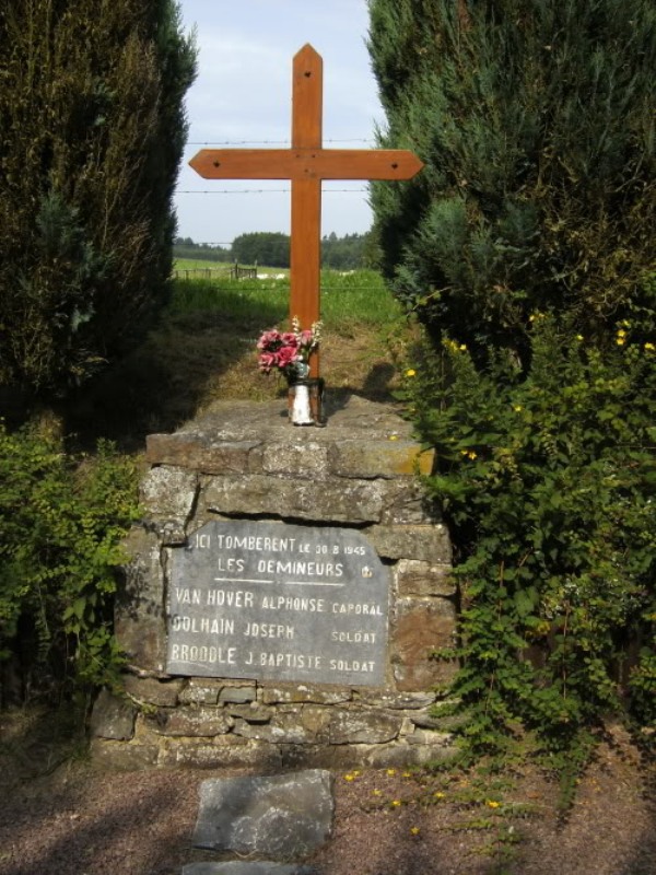 Localisation de ce monument: À la sortie du village de Moinet, sur la route Moinet - Hamiville (GD Luxembourg) Coordonnées GPS: +50°03'02", +05° 50' 45" Inscription figurant sur le monument "ICI TOMBÈRENT LE 30-8-1945 LES DÉMINEURS [Trois noms]" Rénovation: Ce monument a été réaménagé en septembre 2004 Voir les noms mentionnés sur ce monument |
