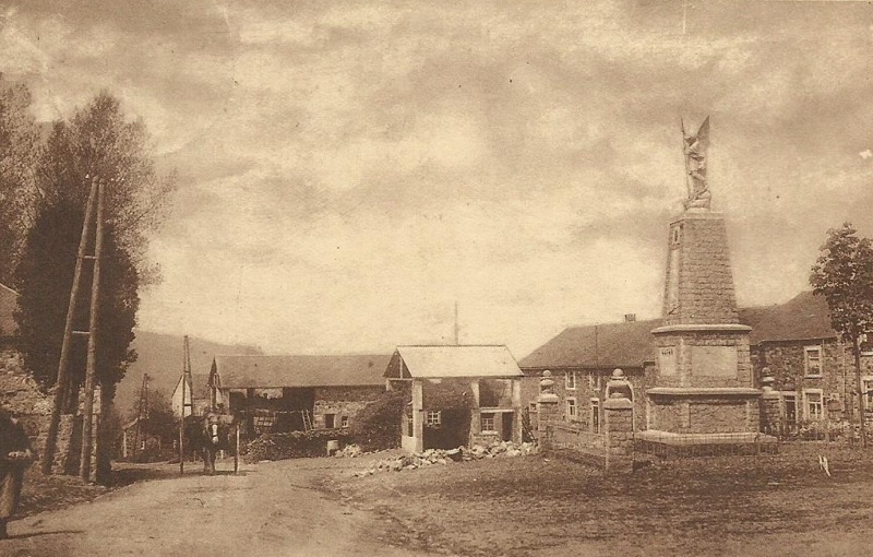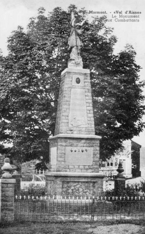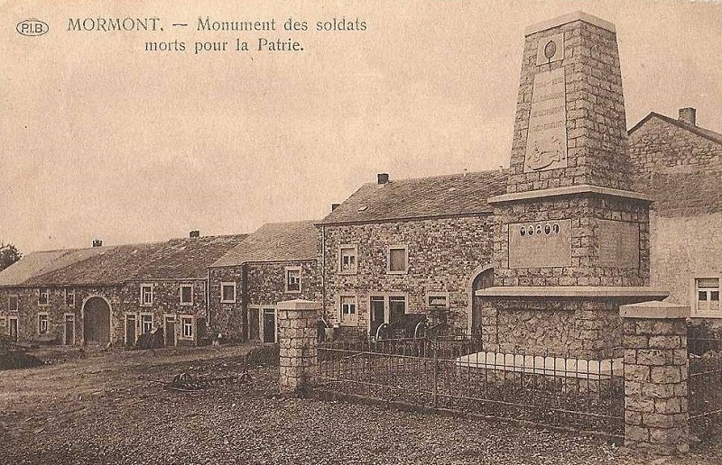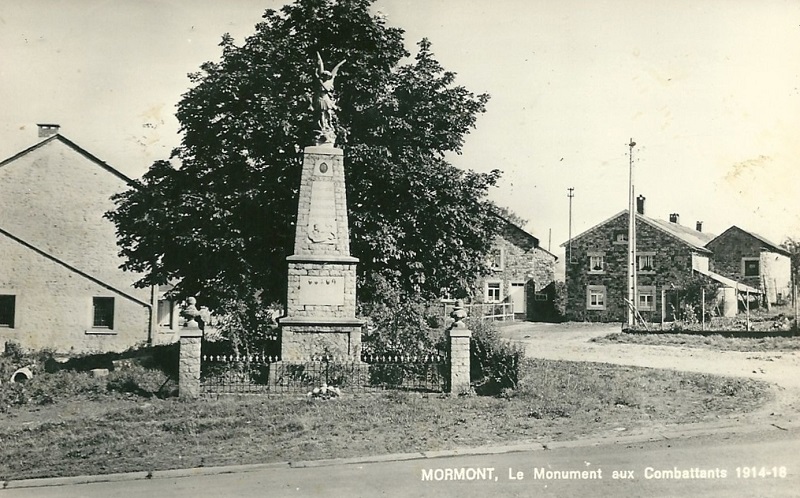 Localisation: Place du monument, en face de l'église. Coordonnées GPS: 50° 19' 32.10" N, 5° 35' 35.65" E Inscriptions Face avant "[Médaillon représentant le roi Albert Ier et la reine Élisabeth] 1914 - 1918 LA COMMUNE DE MORMONT À SES ENFANTS [Gravure d'un lion terrassant l'aigle] [Cinq porcelaines avec les photos (dont une manquante) des morts de 1914 - 1918] MORTS POUR LA PATRIE [Cinq noms, classés par date de décès] [Drapeau belge] À NOS MORTS VICTIMES DE LA GUERRE 40 - 45" Face latérale droite "DÉPORTÉS [Vingt-deux noms répartis sur deux colonnes, classés par ordre alphabétique]" Face latérale gauche "SOLDATS [Dix-neuf noms (dont dix-sept "VOLONTAIRES" répartis sur deux colonnes, classés par ordre alphabétique]" Poème trouvé sur le site http://www.fugitif.net/ih/2186/index.php et consacré aux soldats mentionnés sur ce monument: Clément et Félix CORNET, Joseph MEUNIER, Alfred REMY, Alfred SERON, vous aviez vingt ans... Vous viviez sur les prés pentus de la vallée de l'Aisne. Vous connaissiez les petits sentiers qui le soir venu, vous menaient à Fanzel ou à Hoursinne... Sous la tonnelle, il y avait Agathe et Maria, peut-être même Alice... Vous y buviez une pinte de la bonne bière de Barvaux. Les visages d'Agathe et de Maria étaient tout dorés quand le soleil descendait du côté des Deux-Rys... Clément et Félix CORNET, Joseph MEUNIER, Alfred REMY, Alfred SERON, Vous avez disparu un jour froid d'automne dans la boue des Flandres... Le monument ne comporte pas les noms des victimes de 1940-1945. Cependant, comme on trouve dans le cimetière des tombes de personnes mortes pendant la seconde guerre mondiale, leurs noms ont été ajoutés à la liste des victimes de 1914 - 1918. Voir les noms mentionnés sur ce monument et les tombes au cimetière |