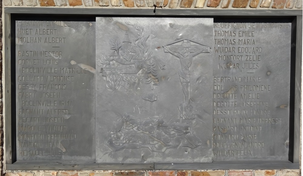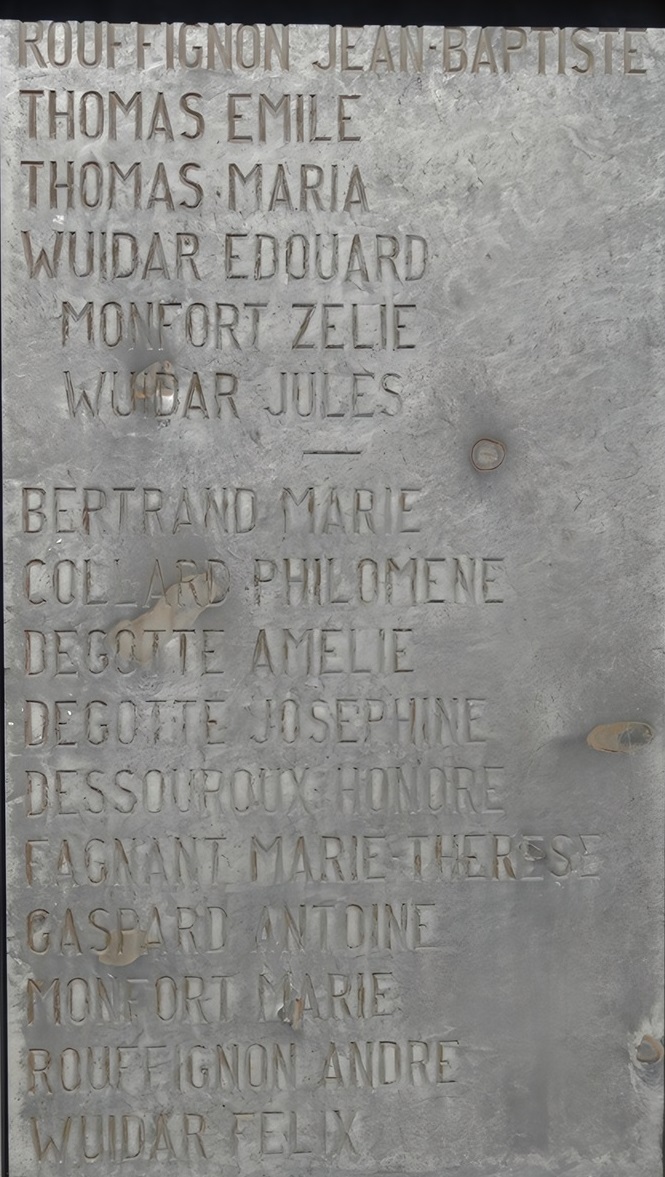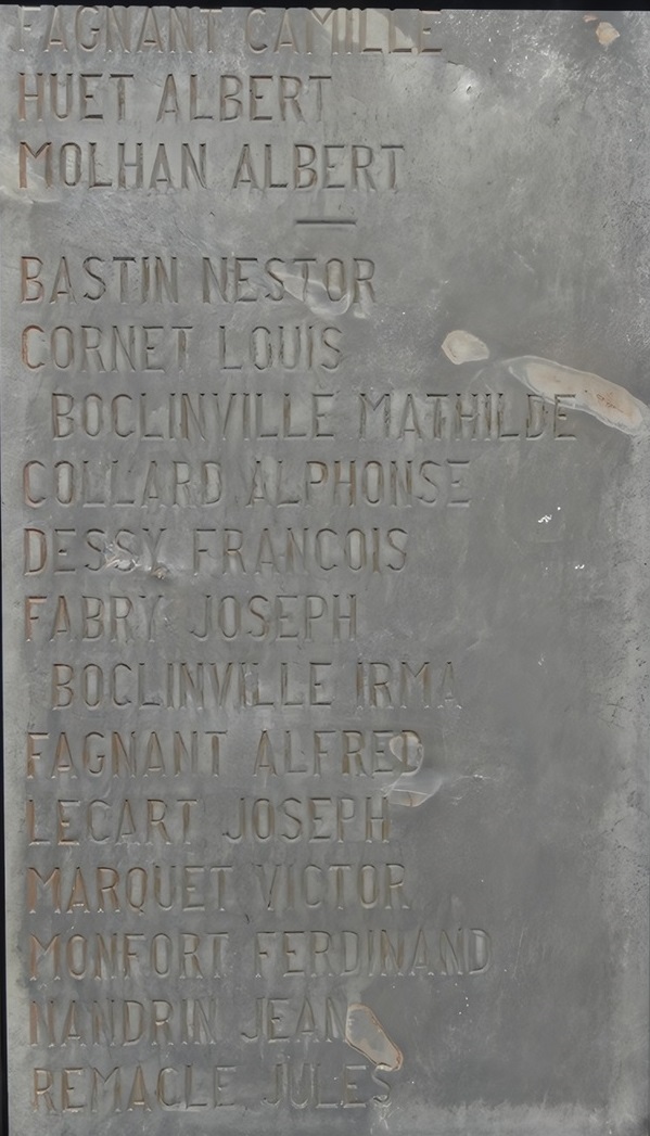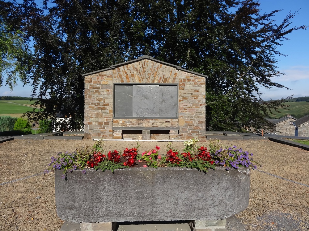 Localisation: À l'angle des Rues du Souvenir et Saint-Donat. Coordonnées GPS: +50°15'17.46", +5°40'56.37" Inscriptions "[Trente-deux noms, sur deux colonnes, non classés par ordre alphabétique]" Voir les noms mentionnés sur le monument |