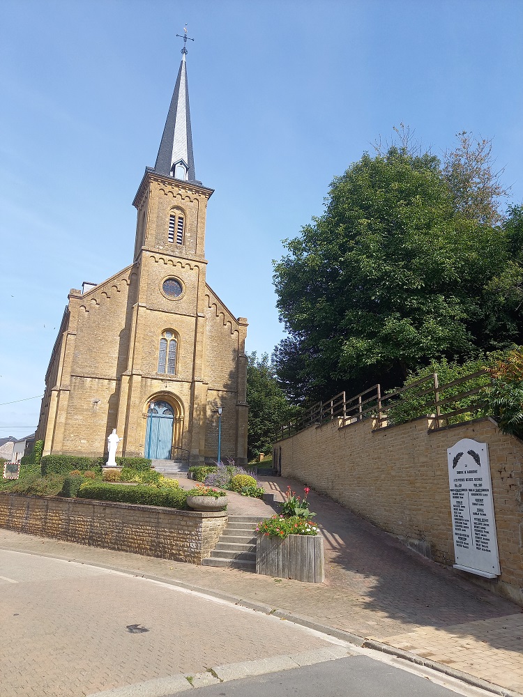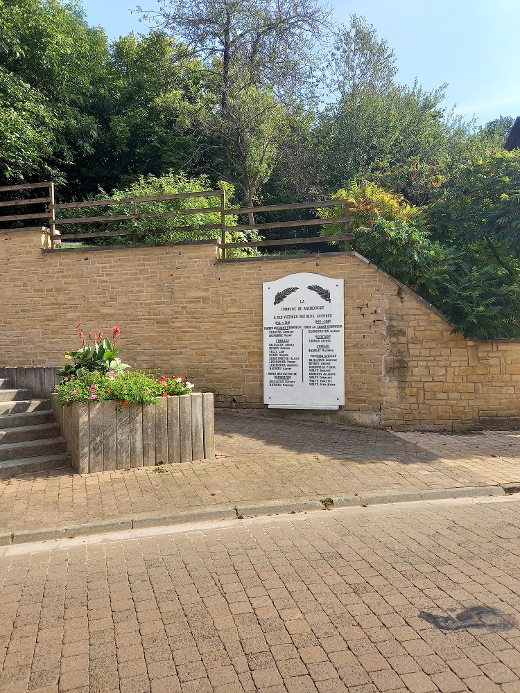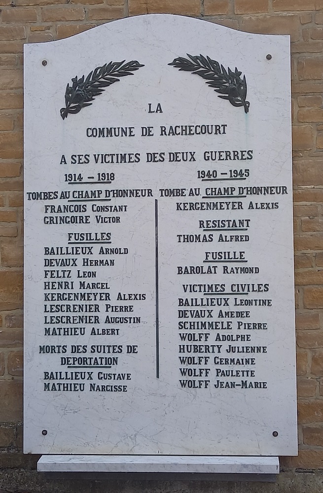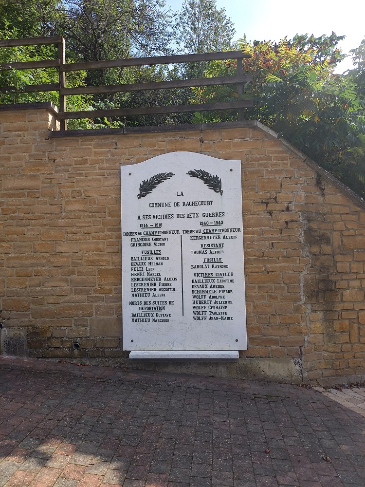 Localisation: Le premier emplacement du monument était à l'intersection des rues du Haut, Basse et de la Strale, sur l'ancienne maison communale; ce dernier bâtiment ayant été réaménagé, le monument a été transféré sur le mur qui jouxte la rampe d'accès à l'église Assomption de Notre-Dame, rue de la Strale. La date de transfert se situe entre 2013 et 2021. Coordonnées GPS: emplacement actuel: +49°35'27.1", +5°43'36.2"; premier emplacement: +49°35'32.02", +5°43'26.94" Inscriptions "LA COMMUNE DE RACHECOURT À SES VICTIMES DES DEUX GUERRES 1914-1918 TOMBÉS AU CHAMP D'HONNEUR [Deux noms, classés par ordre alphabétique] FUSILLÉS [Huit noms, classés par ordre alphabétique] MORTS DES SUITES DE DÉPORTATION [Deux noms, classés par ordre alphabétique] 1940-1945 TOMBÉS AU CHAMP D'HONNEUR [Un nom] RÉSISTANT [Un nom] FUSILLÉ [Un nom] VICTIMES CIVILES [Huit noms, classés par ordre alphabétique sauf un]" Voir les noms mentionnés sur ce monument |