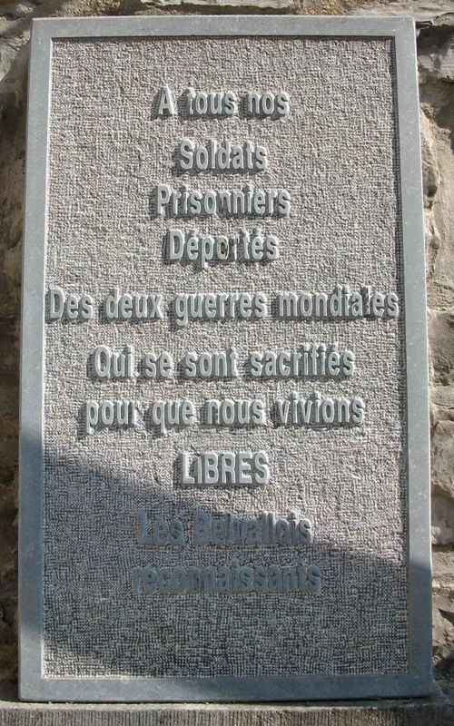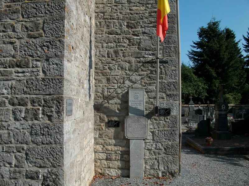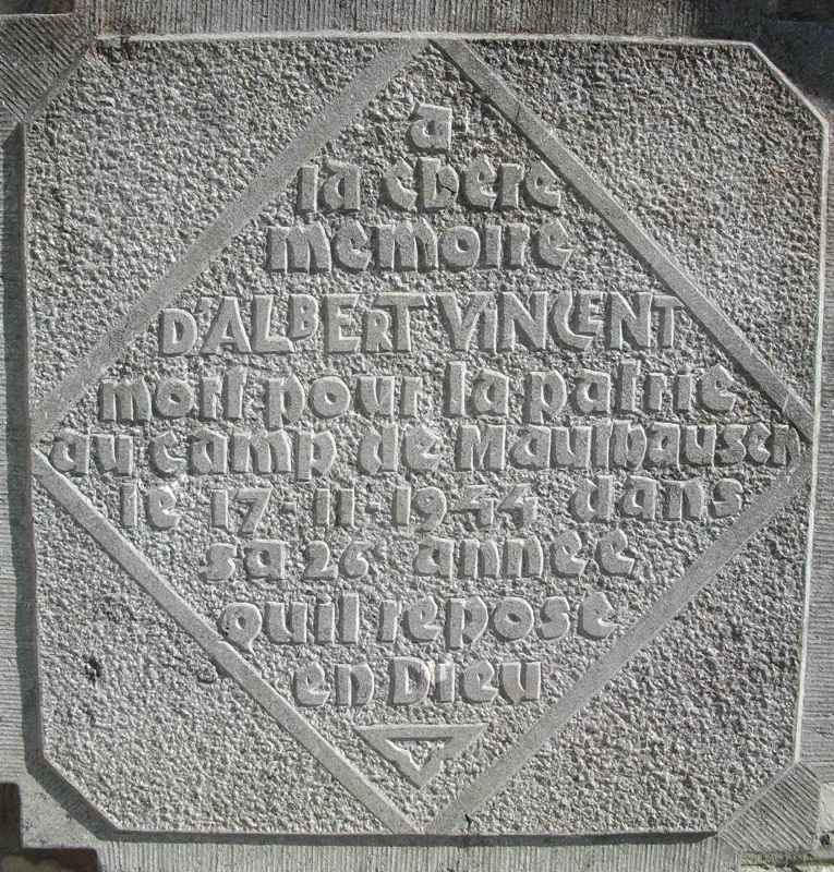 Localisation: Sur la façade de l'église de BELVAUX, rue du Hambeau. Coordonnées GPS: +50°06'20.59", +5°11'48.12" Inscription figurant sur le monument Plaque supérieure "À TOUS NOS SOLDATS PRISONNIERS DÉPORTÉS DES DEUX GUERRES MONDIALES QUI SE SONT SACRIFIÉS POUR QUE NOUS VIVIONS LIBRES LES BELVALLOIS RECONNAISSANTS" Plaque inférieure "À / LA CHÈRE / MÉMOIRE D'ALBERT VINCENT MORT POUR LA PATRIE AU CAMP DE MAUTHAUSEN LE 17-11-1944 DANS SA 26E ANNÉE QU'IL REPOSE EN DIEU" Plus d'informations concernant cette personne |