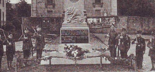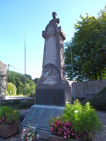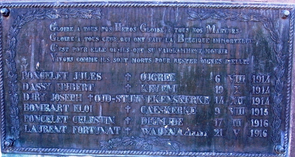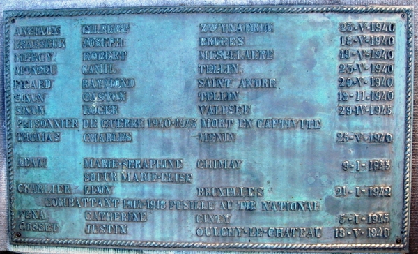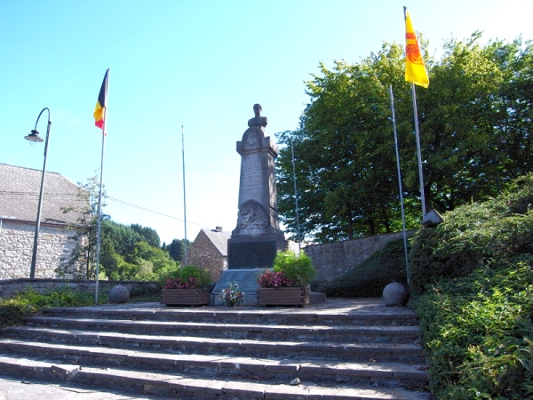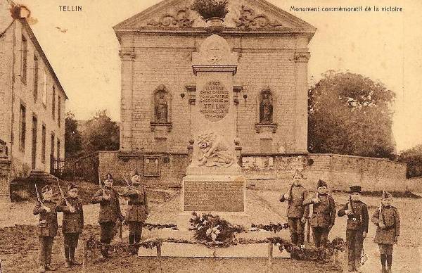 Localisation de ce monument: Au pied de l'église, à l'intersection de la rue Grande et de la rue de l'Église. Coordonnées GPS: +50°04'51.27", +5°13'00.75". Inscription figurant sur le monument "À SES GLORIEUX ENFANTS TOMBÉS POUR LA PATRIE LA COMMUNE DE TELLIN RECONNAISSANTE 1914 - 1918" "GLOIRE À TOUS NOS HÉROS GLOIRE À TOUS NOS MARTYRS GLOIRE À TOUS CEUX QUI ONT FAIT LA BELGIQUE IMMORTELLE C'EST POUR ELLE QU'ILS ONT SU VAILLAMMENT MOURIR VIVONS COMME ILS SONT MORTS POUR RESTER DIGNES D'ELLE. [Six noms de 1914-1918, non classés par ordre alphabétique, avec mention du lieu et de la date de décès]" "[Sept noms de 1940-1945, classés par ordre alphabétique, avec mention du lieu et de la date de décès] PRISONNIER DE GUERRE 1940-1945 MORT EN CAPTIVITÉ [Trois noms de 1940-1945, non classés par ordre alphabétique, avec mention du lieu et de la date de décès] COMBATTANT 1914-1918 FUSILLÉ AU TIR NATIONAL [Deux noms de 1940-1945, non classés par ordre alphabétique, avec mention du lieu et de la date de décès]" Voir les noms mentionnés sur ce monument |