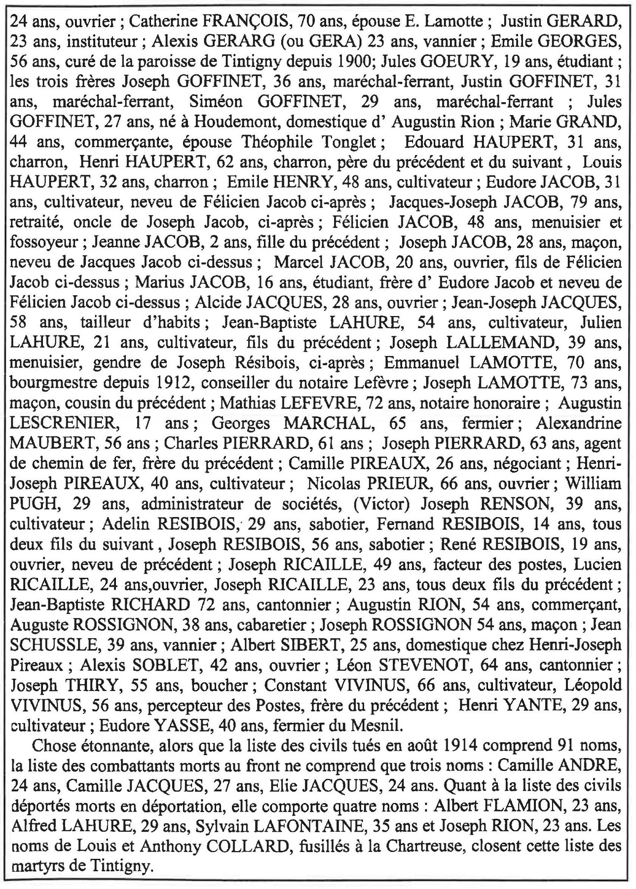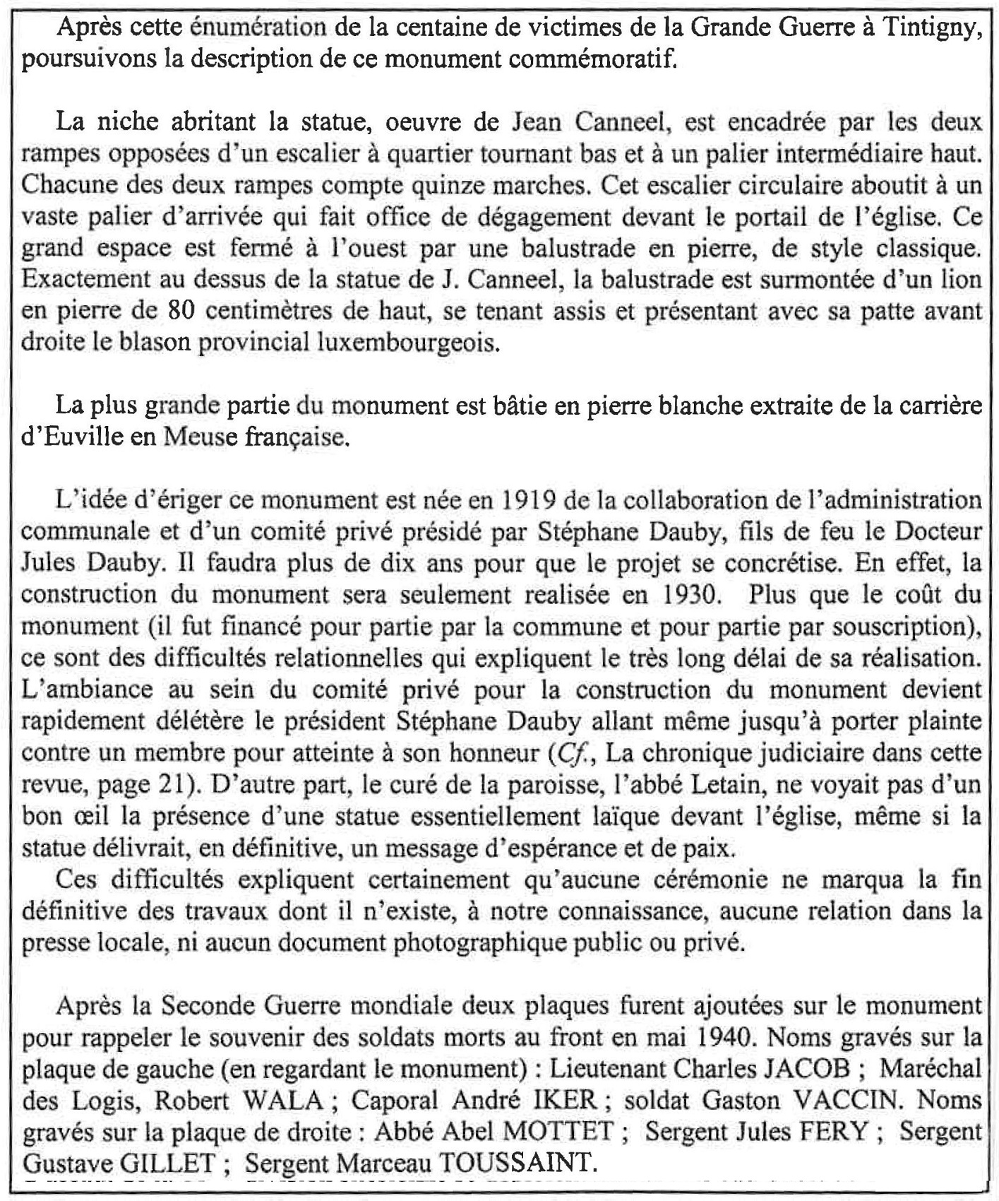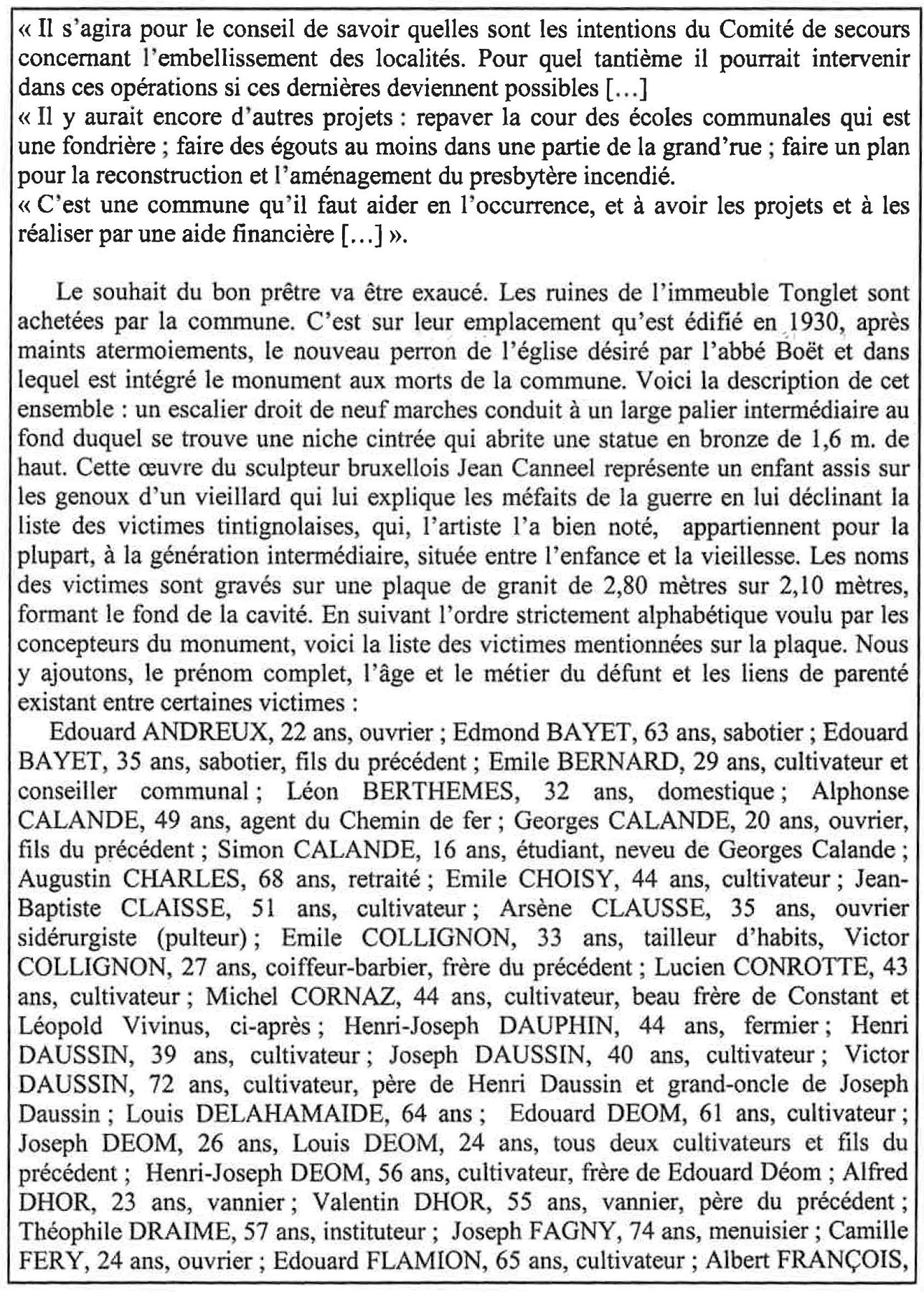 Localisation de ce monument: Parvis de l'église, au croisement de la rue de la Semois et de la Grand-Rue (c'est-à-dire la N83 Arlon - Florenville). Coordonnées GPS: 49° 41'00.59" N, 5° 30' 47.77" E. Inscription figurant sur ce monument Plaque située derrière la statue "À NOS HÉROS ET MARTYRS [Dix-huit noms de victimes civiles, classés par ordre alphabétique] [Vingt-huit noms de victimes civiles, classés par ordre alphabétique] COMBATTANTS [Trois noms, classés par ordre alphabétique] DÉPORTÉS [Quatre noms, classés par ordre alphabétique] FUSILLÉS À LA CHARTREUSE [Deux noms, classés par ordre alphabétique] [Vingt-huit noms de victimes civiles, classés par ordre alphabétique] [Dix-sept noms de victimes civiles, classés par ordre alphabétique]" Plaques aux Chasseurs ardennais Plaque de gauche "[Hure des Chasseurs ardennais tournée vers la gauche] [Croix] [Quatre noms, classés par grade] 1940 - 1945 MORTS POUR LA PATRIE" Plaque de droite "[Hure des Chasseurs ardennais tournée vers la droite] [Croix] [Quatre noms, classés par grade] 1940 - 1945 MORTS POUR LA PATRIE" Histoire Tenus en échec à Saint-Vincent et à Bellefontaine par les troupes françaises et ne pouvant s'en prendre aux civils des villages où l'on se battait, les soldats allemands, encouragés par leurs chefs, trouvèrent plus facile et moins dangereux de rester à l'arrière pour terroriser une paisible population, massacrer des innocents et incendier des maisons, sous prétexte de francs-tireurs. Bilan pour la commune de Tintigny (qui comptait 1.261 habitants): 60 civils tués et 106 maisons incendiées (Source [2]). Description du monument Monument en pierre d'Euville dans lequel est inséré une plaque en granit avec les noms des victimes. Sculpteur: Jean CANNEEL, de Saint-Gilles (Bruxelles). Architecte: M. LAMY, d'Arlon (Source [13]) Voir les noms mentionnés sur ce monument |