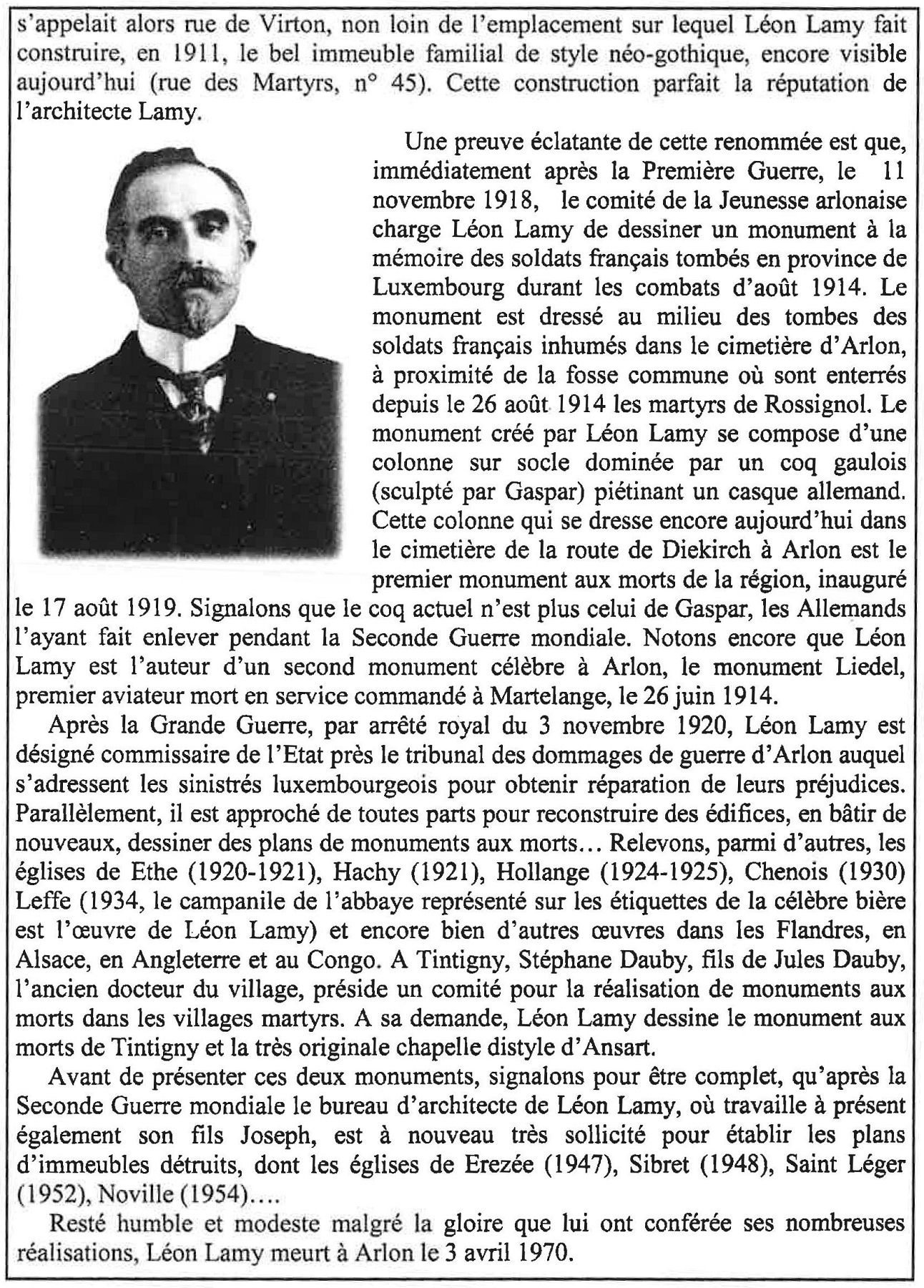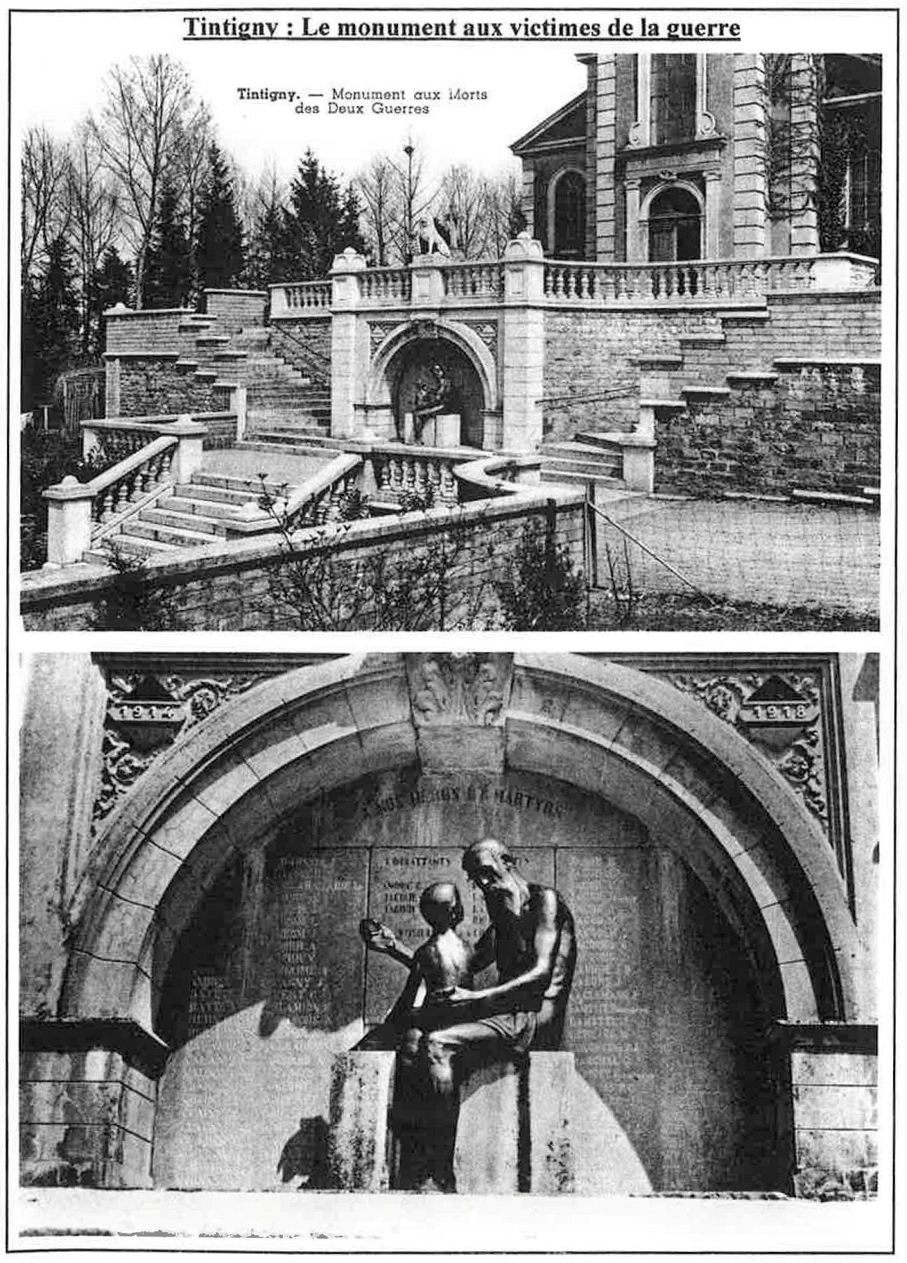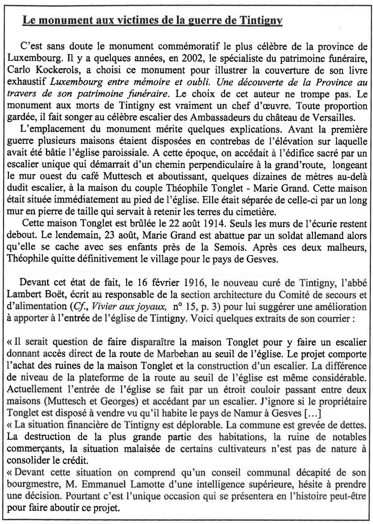 Localisation de ce monument: Parvis de l'église, au croisement de la rue de la Semois et de la Grand-Rue (c'est-à-dire la N83 Arlon - Florenville). Coordonnées GPS: 49° 41'00.59" N, 5° 30' 47.77" E. Inscription figurant sur ce monument Plaque située derrière la statue "À NOS HÉROS ET MARTYRS [Dix-huit noms de victimes civiles, classés par ordre alphabétique] [Vingt-huit noms de victimes civiles, classés par ordre alphabétique] COMBATTANTS [Trois noms, classés par ordre alphabétique] DÉPORTÉS [Quatre noms, classés par ordre alphabétique] FUSILLÉS À LA CHARTREUSE [Deux noms, classés par ordre alphabétique] [Vingt-huit noms de victimes civiles, classés par ordre alphabétique] [Dix-sept noms de victimes civiles, classés par ordre alphabétique]" Plaques aux Chasseurs ardennais Plaque de gauche "[Hure des Chasseurs ardennais tournée vers la gauche] [Croix] [Quatre noms, classés par grade] 1940 - 1945 MORTS POUR LA PATRIE" Plaque de droite "[Hure des Chasseurs ardennais tournée vers la droite] [Croix] [Quatre noms, classés par grade] 1940 - 1945 MORTS POUR LA PATRIE" Histoire Tenus en échec à Saint-Vincent et à Bellefontaine par les troupes françaises et ne pouvant s'en prendre aux civils des villages où l'on se battait, les soldats allemands, encouragés par leurs chefs, trouvèrent plus facile et moins dangereux de rester à l'arrière pour terroriser une paisible population, massacrer des innocents et incendier des maisons, sous prétexte de francs-tireurs. Bilan pour la commune de Tintigny (qui comptait 1.261 habitants): 60 civils tués et 106 maisons incendiées (Source [2]). Description du monument Monument en pierre d'Euville dans lequel est inséré une plaque en granit avec les noms des victimes. Sculpteur: Jean CANNEEL, de Saint-Gilles (Bruxelles). Architecte: M. LAMY, d'Arlon (Source [13]) Voir les noms mentionnés sur ce monument |