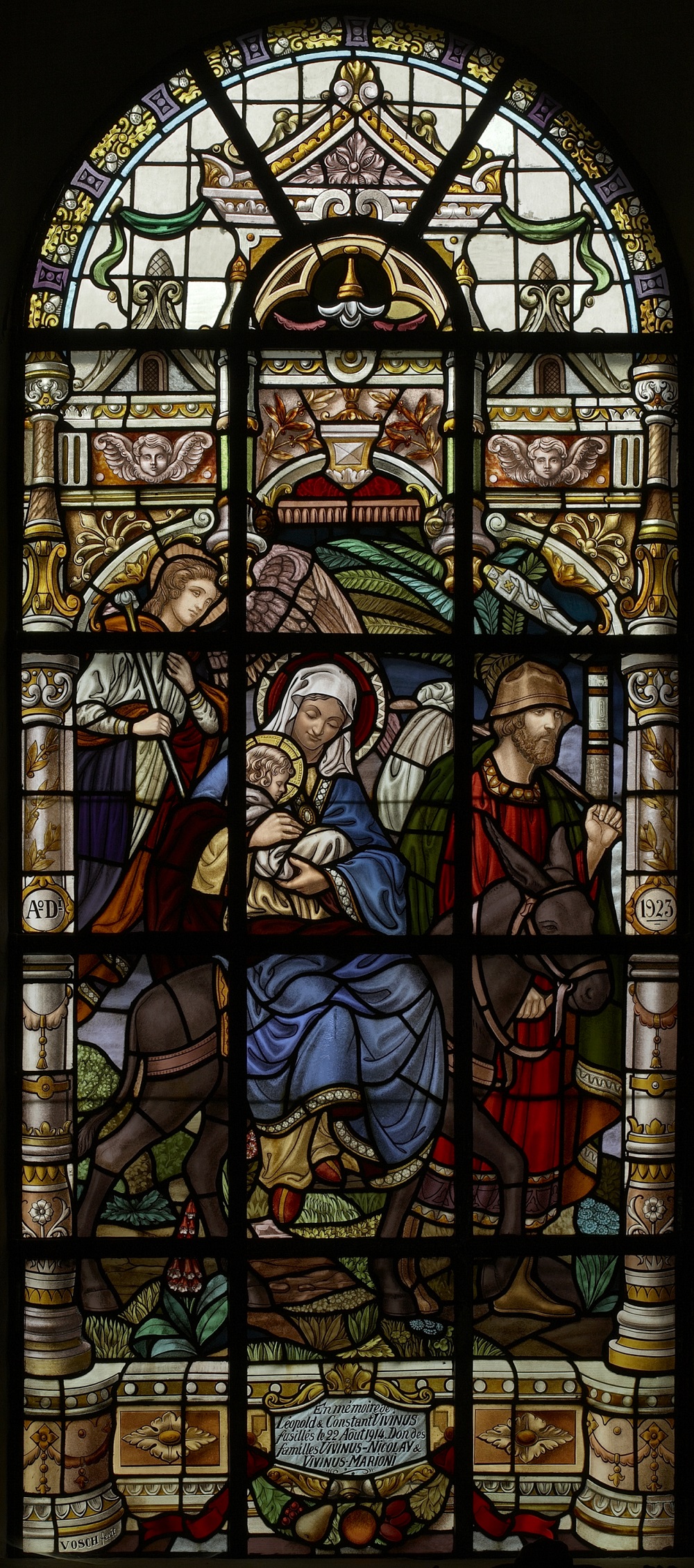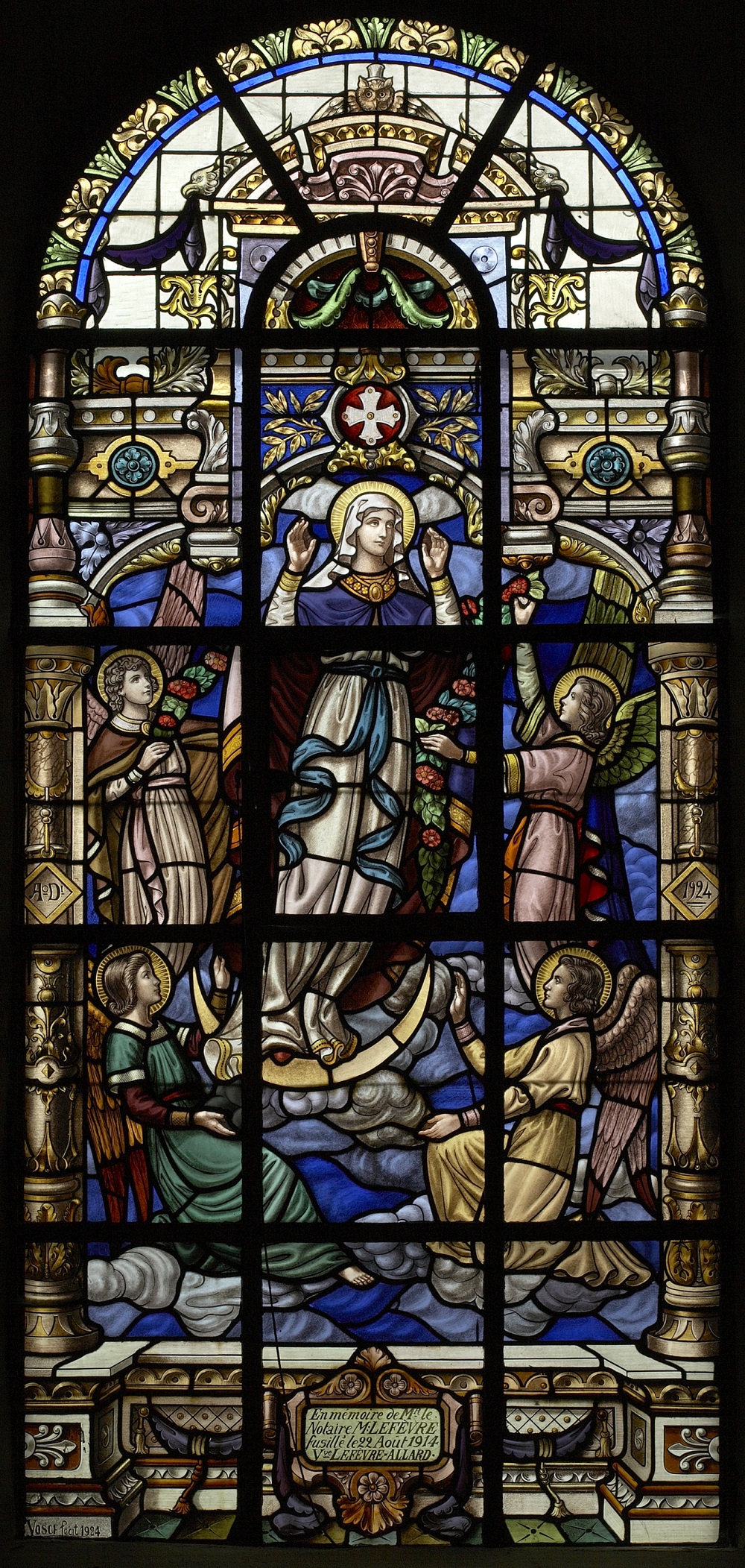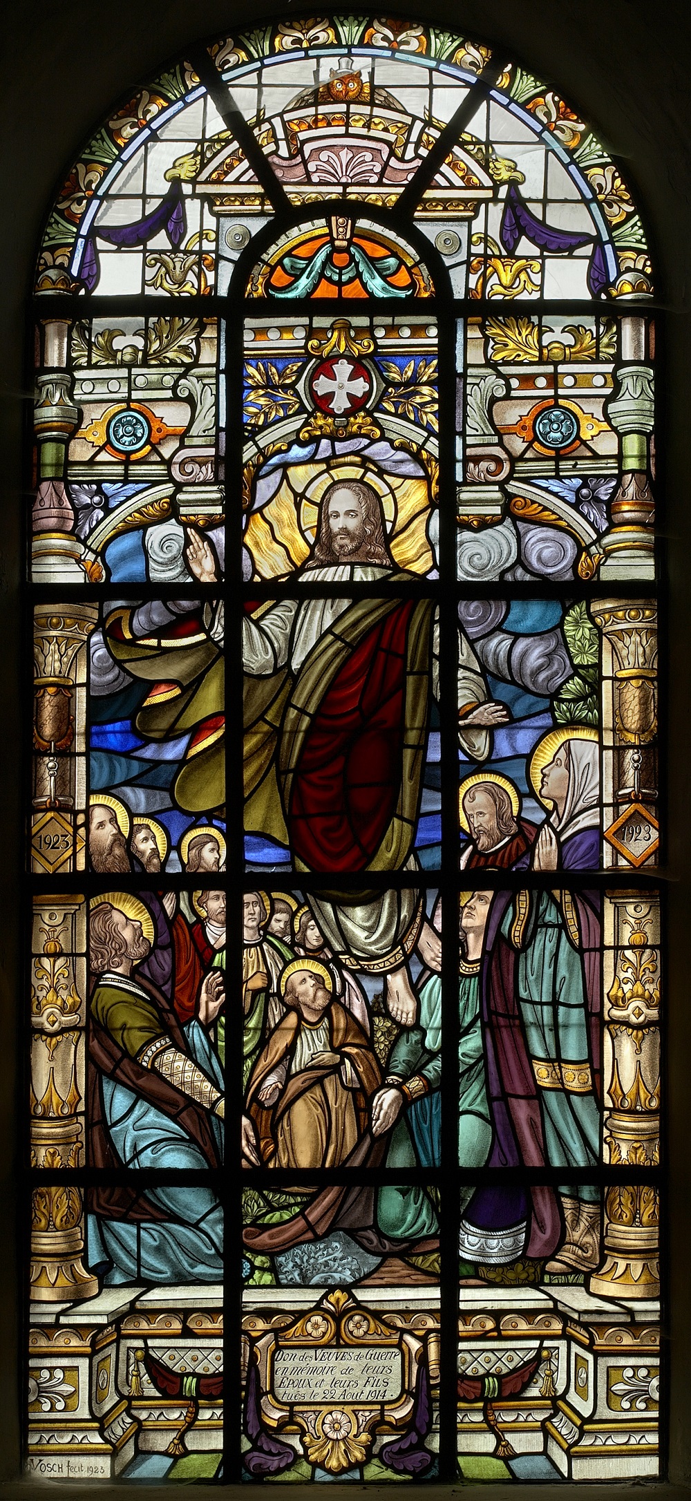 Localisation: Église Notre-Dame-de-l'Assomption. Coordonnées GPS: +49°41'01.4", +5°30'51.0" Inscriptions Ascension du Christ "DON DES VEUVES DE GUERRE EN MÉMOIRE DE LEURS ÉPOUX ET LEURS FILS TUÉS LE 22 AOÛT 1914." Fuite en Egypte "EN MÉMOIRE DE LÉOPOLD & CONSTANT VIVINUS FUSILLÉS LE 22 AOÛT 1914. DON DES FAMILLES VIVINUS-NICOLAY & VIVINUS-MARIONI" Sacré-Coeur du Christ apparaît à sainte Marguerite-Marie Alacocque "EN MÉMOIRE DE ALPHONSE GEORGES & SIMON CALANDE FUSILLÉS LE 22 AOÛT 1914. DON DES FAMILLES CALANDE-WALA" Enfance de Jésus "À LA MÉMOIRE DE LUCIEN CONROTTE FUSILLÉ LE 22 AOÛT 1914." Assomption "EN MÉMOIRE DE MR LE NOTAIRE M: LEFÈVRE FUSILLÉ LE 22 AOÛT 1914 VVE LEFÈVRE-ALLARD." Eucharistie "À LA MÉMOIRE DE MR L'ABBÉ GEORGES CURÉ DE CETTE PAROISSE IMMOLÉ AVEC SES PAROISSIENS LE 22 AOÛT 1914. LA PAROISSE RECONNAISSANTE." Créateur: J. Vosch (verrier) (signé "Vosch fecit") (Source [255]) Date de création: 1923 - 1924 (Source [255]) Plus d'informations concernant les personnes mentionnées sur ces vitraux |