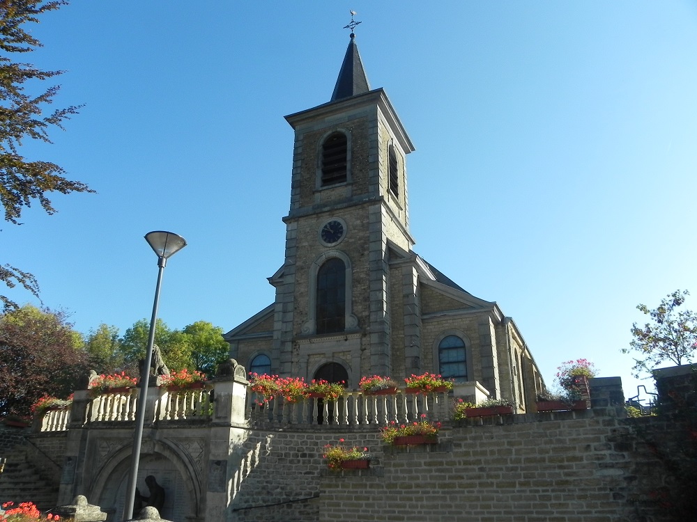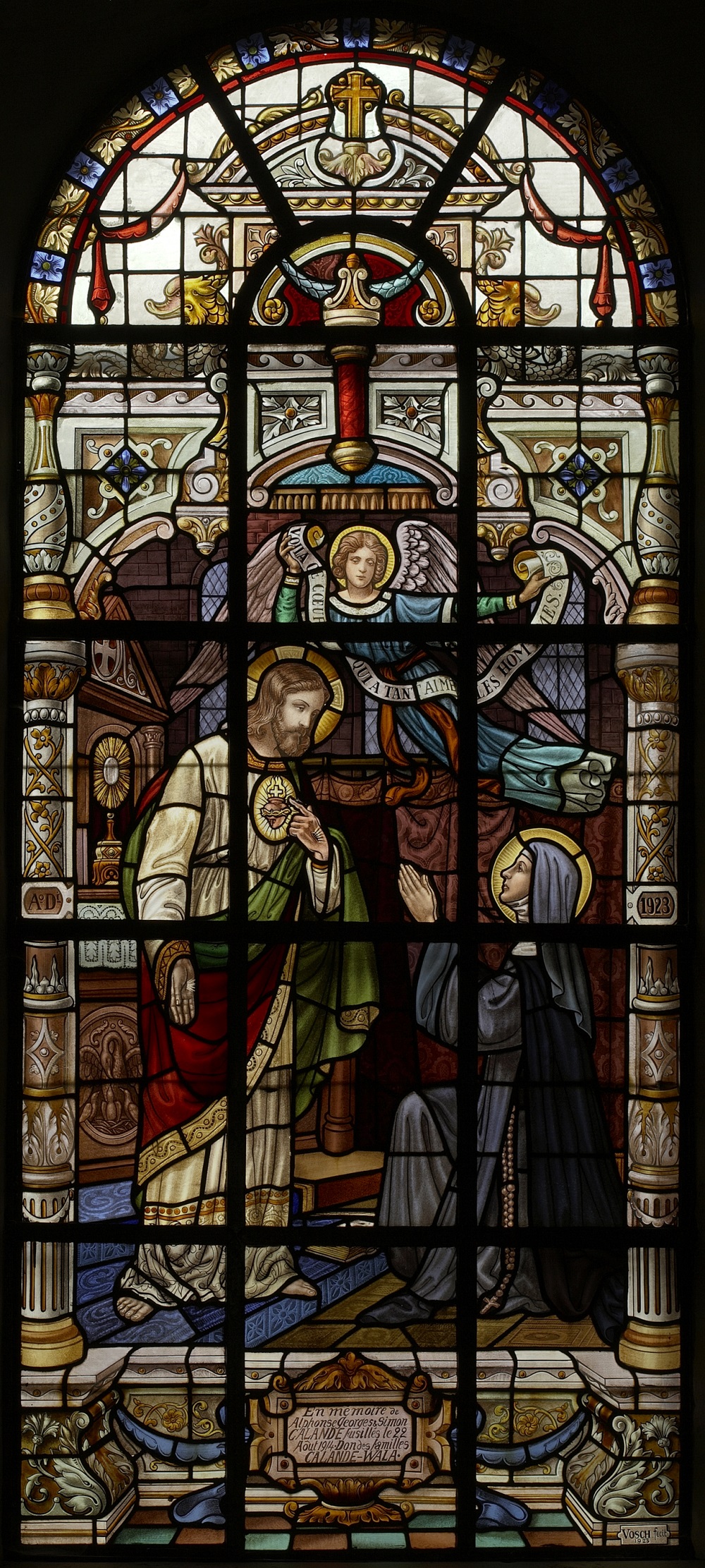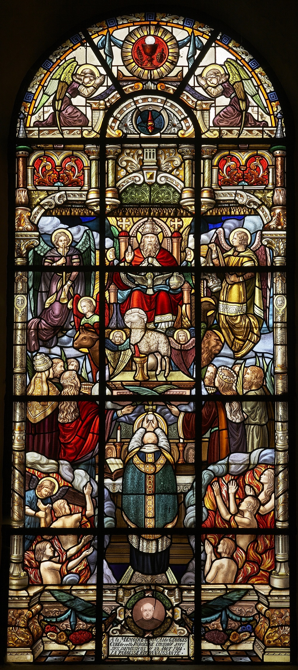 Localisation: Église Notre-Dame-de-l'Assomption. Coordonnées GPS: +49°41'01.4", +5°30'51.0" Inscriptions Ascension du Christ "DON DES VEUVES DE GUERRE EN MÉMOIRE DE LEURS ÉPOUX ET LEURS FILS TUÉS LE 22 AOÛT 1914." Fuite en Egypte "EN MÉMOIRE DE LÉOPOLD & CONSTANT VIVINUS FUSILLÉS LE 22 AOÛT 1914. DON DES FAMILLES VIVINUS-NICOLAY & VIVINUS-MARIONI" Sacré-Coeur du Christ apparaît à sainte Marguerite-Marie Alacocque "EN MÉMOIRE DE ALPHONSE GEORGES & SIMON CALANDE FUSILLÉS LE 22 AOÛT 1914. DON DES FAMILLES CALANDE-WALA" Enfance de Jésus "À LA MÉMOIRE DE LUCIEN CONROTTE FUSILLÉ LE 22 AOÛT 1914." Assomption "EN MÉMOIRE DE MR LE NOTAIRE M: LEFÈVRE FUSILLÉ LE 22 AOÛT 1914 VVE LEFÈVRE-ALLARD." Eucharistie "À LA MÉMOIRE DE MR L'ABBÉ GEORGES CURÉ DE CETTE PAROISSE IMMOLÉ AVEC SES PAROISSIENS LE 22 AOÛT 1914. LA PAROISSE RECONNAISSANTE." Créateur: J. Vosch (verrier) (signé "Vosch fecit") (Source [255]) Date de création: 1923 - 1924 (Source [255]) Plus d'informations concernant les personnes mentionnées sur ces vitraux |