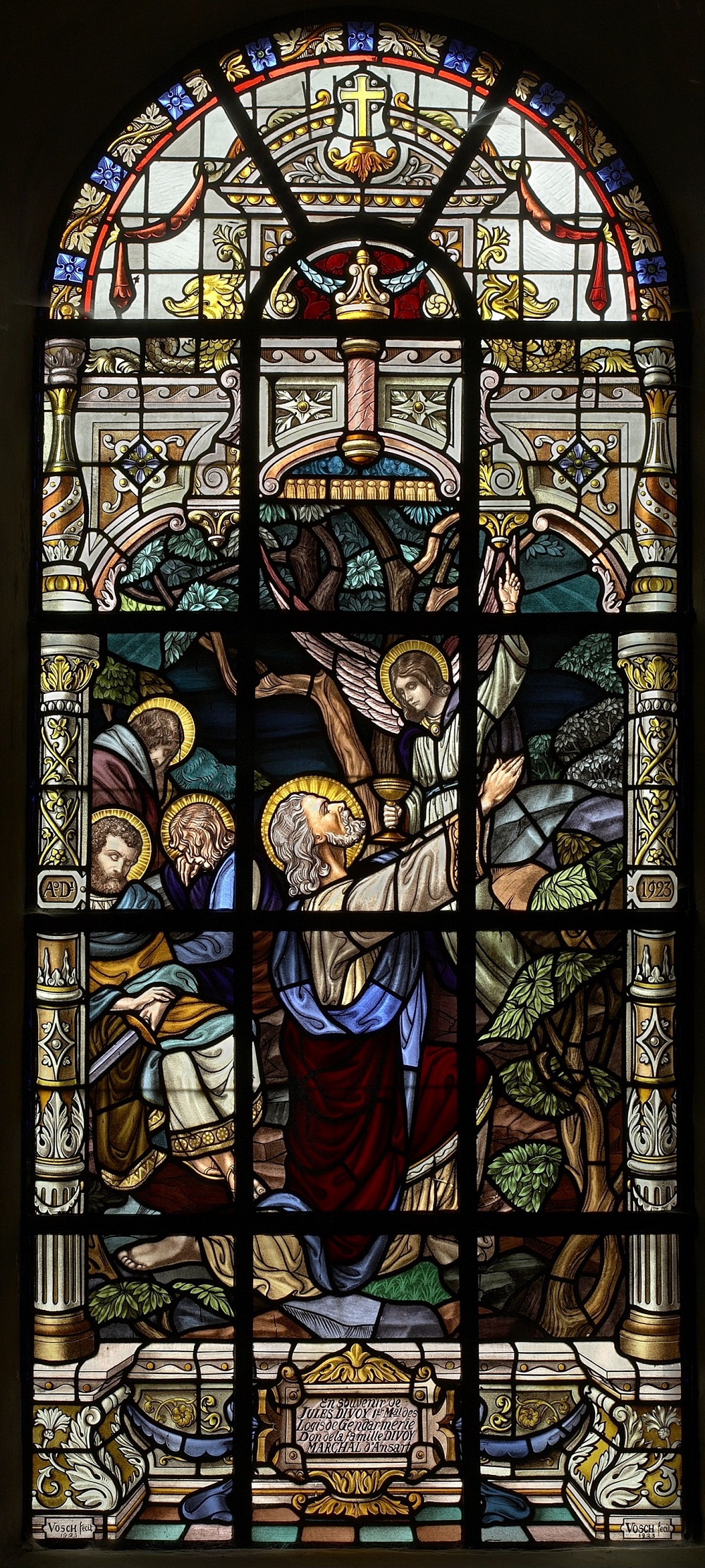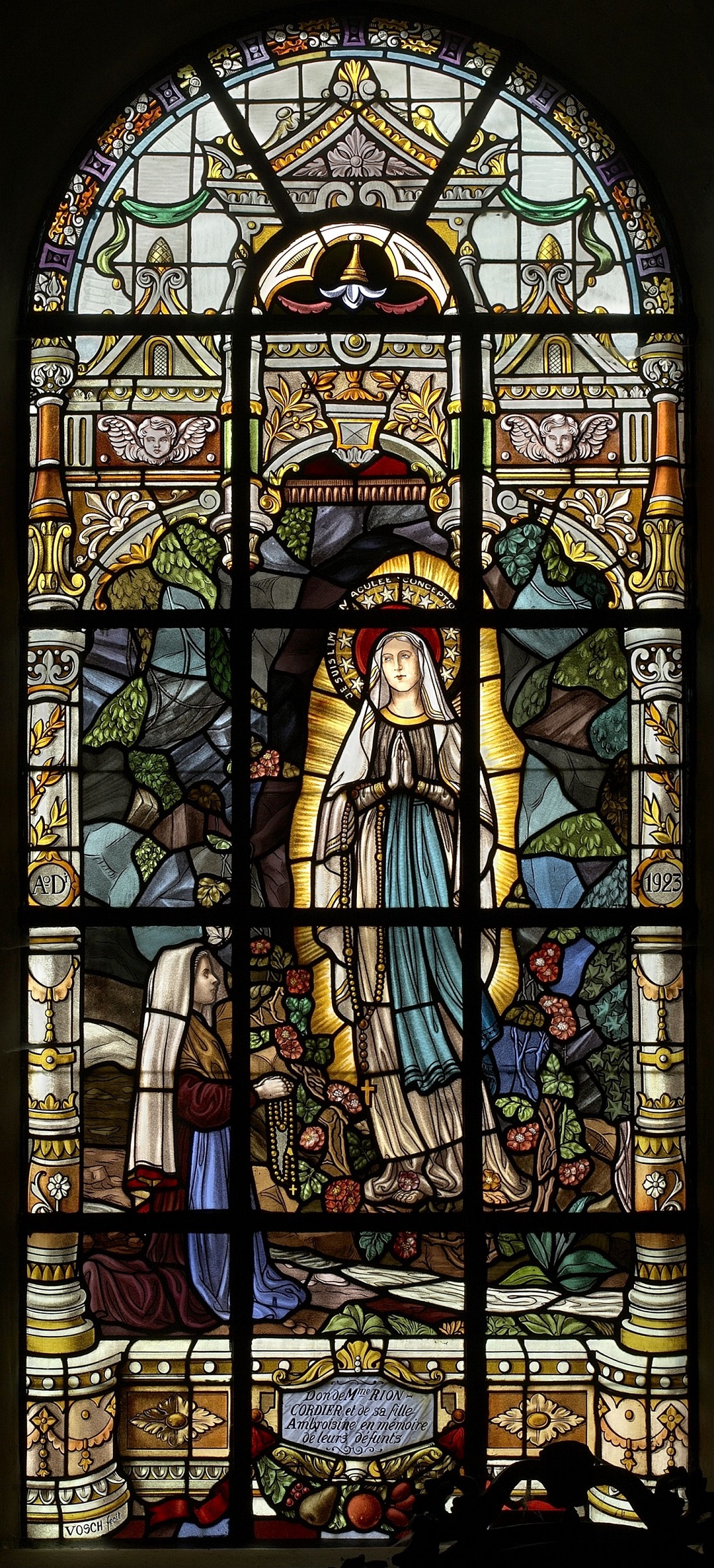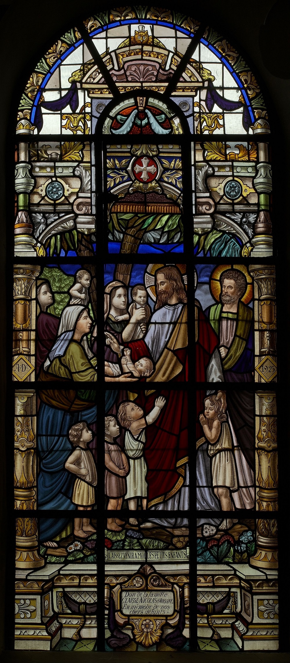 Localisation: Église Notre-Dame-de-l'Assomption. Coordonnées GPS: +49°41'01.4", +5°30'51.0" Description L'église de Tintigny conserve un ensemble de vitraux commémoratifs de la Première Guerre Mondiale : neuf des douze vitraux ont été offerts en mémoire des victimes du 22 août 1914. Ce jour-là, les troupes allemandes incendient 183 maisons dans le village et fusillent 93 habitants. De semblables exactions sont commises dans le village voisin de Rossignol. Les noms des victimes de Tintigny figurent sur le monument placé devant l'église. Les vitraux sont endommagés lors de la Seconde Guerre Mondiale; en 1943, la CRMS (Commission royale des Monuments et des Sites) autorise leur restauration (Source [492]). Inscriptions Ascension du Christ "1923 - 1923 DON DES VEUVES DE GUERRE EN MÉMOIRE DE LEURS ÉPOUX ET LEURS FILS TUÉS LE 22 AOÛT 1914." Assomption "A[NN]O D[OMIN]I 1924 EN MÉMOIRE DE MR LE NOTAIRE M: LEFÈVRE FUSILLÉ LE 22 AOÛT 1914 VVE LEFÈVRE-ALLARD." Enfance de Jésus - Atelier de Nazareth "A[NN]O D[OMIN]I 1923 À LA MÉMOIRE DE LUCIEN CONROTTE FUSILLÉ LE 22 AOÛT 1914." Laissez venir à moi les petits enfants "A[NN]O D[OMIN]I 1923 LAISSEZ VENIR À MOI LES PETITS ENFANTS DON DE LA FAMILLE CLAISSE-NICOLAS D'ANSART. EN MÉMOIRE DE NOS CHERS DÉFUNTS." Notre-Dame de Lourdes "A[NN]O D[OMIN]I 1923 JE SUIS L'IMMACULÉE CONCEPTION DON DE MME RION - CORDIER ET DE SA FILLE AMBROISINE EN MÉMOIRE DE LEURS DÉFUNTS" Sacré-Coeur du Christ apparaît à sainte Marguerite-Marie Alacocque "A[NN]O D[OMIN]I 1923 VOILÀ CE CŒUR QUI A TANT AIMÉ LES HOMMES EN MÉMOIRE DE ALPHONSE GEORGES & SIMON CALANDE FUSILLÉS LE 22 AOÛT 1914. DON DES FAMILLES CALANDE-WALA." Christ au jardin des Oliviers "A[NN]O D[OMIN]I 1923 EN SOUVENIR DE JULES DIVOY 1ER MAL DES LOGIS DE GENDARMERIE DON DE LA FAMILLE DIVOY MARCHAL D'ANSART" Fuite en Egypte "A[NN]O D[OMIN]I 1923 EN MÉMOIRE DE LÉOPOLD & CONSTANT VIVINUS FUSILLÉS LE 22 AOÛT 1914. DON DES FAMILLES VIVINUS-NICOLAY & VIVINUS-MARIONI" Eucharistie "A[NN]O D[OMIN]I 1923 [Médaillon photo de l'abbé GEORGES] À LA MÉMOIRE DE MR L'ABBÉ GEORGES CURÉ DE CETTE PAROISSE IMMOLÉ AVEC SES PAROISSIENS LE 22 AOÛT 1914. LA PAROISSE RECONNAISSANTE." Dimensions : environ 2,60 mètres de hauteur (Source [492]). Créateur: J. Vosch (verrier) (signé "Vosch fecit") (Sources [255]). Date de création: 1923 - 1924 (Source [255]; [492]) . Plus d'informations concernant les personnes mentionnées sur ces vitraux |