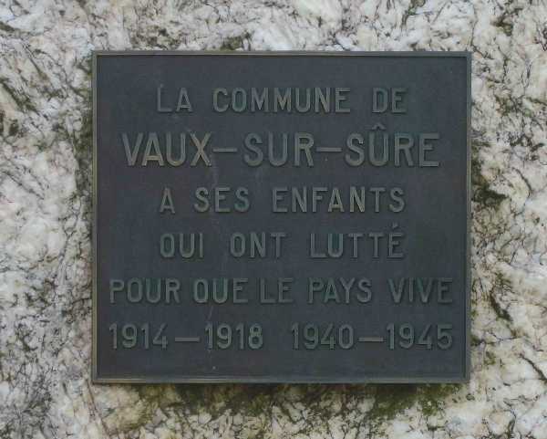 Localisation de ce monument: Place du Marché. Coordonnées GPS: 49° 54' 38.59" N, 5° 33' 55.00" E. Inscription figurant sur ce monument "LA COMMUNE DE VAUX-SUR-SŪRE Ą SES ENFANTS QUI ONT LUTTÉ POUR QUE LE PAYS VIVE 1914 - 1918 1940 - 1945" Ce monument ne comporte pas de noms. |