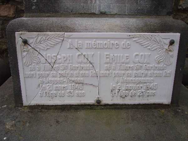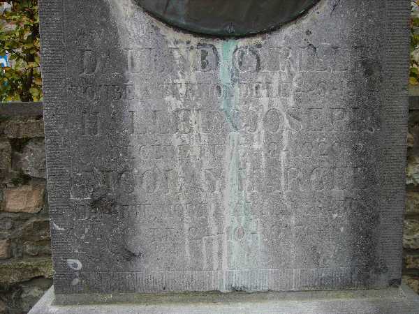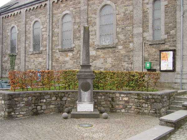 Localisation de ce monument: À côté de l'église dans la rue principale. Coordonnées GPS: 50° 21' 40 " N, 5° 34' 40" E. Inscription figurant sur ce monument Face avant "À NOS HÉROS [Médaillon] ALBERT ROI DES BELGES [Trois noms de 1914 - 1918, classés par ordre alphabétique, avec indication du lieu et de la date de décès] À LA MÉMOIRE DE [Deux noms de 1940 - 1945, avec indication du lieu de naissance, du lieu et de la date de décès ainsi que de l'âge au décès]" Face latérale 1 "Quatre noms, non classés par ordre alphabétique]" Face latérale 2 "Quatre noms, non classés par ordre alphabétique]" Voir les noms mentionnés sur ce monument |