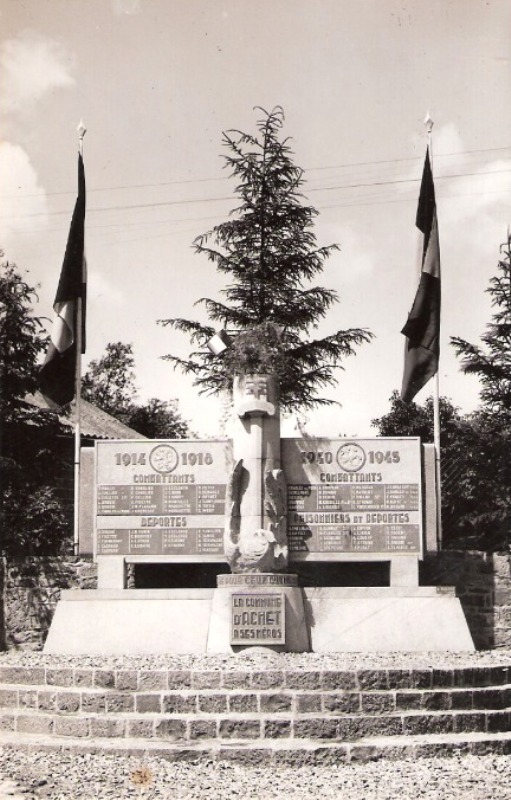 Localisation: À l'angle de la Rue d'Achet et de la Rue du Chainisse. Coordonnées GPS: +50°19'59.89", +5°10'24.56" Inscriptions Sur la partie centrale "... POUR CEUX QUI ... (phrase incomplète) LA COMMUNE D'ACHET À SES HÉROS" Sur la partie gauche "1914 - 1918 L'UNION FAIT LA FORCE COMBATTANTS [Vingt-quatre noms, sur quatre colonnes, classés par ordre alphabétique sauf un] DÉPORTÉS [Dix-neuf noms, sur quatre colonnes, classés par ordre alphabétique sauf un] Sur la partie droite "1940 - 1945 POUR LE DROIT ET DIEU COMBATTANTS [Vingt noms, sur quatre colonnes, classés par ordre alphabétique sauf cinq] PRISONNIERS ET DÉPORTÉS [Vingt noms, sur quatre colonnes, classés par ordre alphabétique sauf trois]" Réalisation du monument: A. HUBERT de Namur Voir les noms mentionnés sur ce monument |