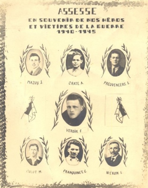 Localisation: Collection privée Inscriptions "ASSESSE EN SOUVENIR DE NOS HÉROS ET VICTIMES DE LA GUERRE 1940-1945 [Sept noms, avec photo, non classés par ordre alphabétique]" Voir les noms mentionnés sur cette photo-souvenir |