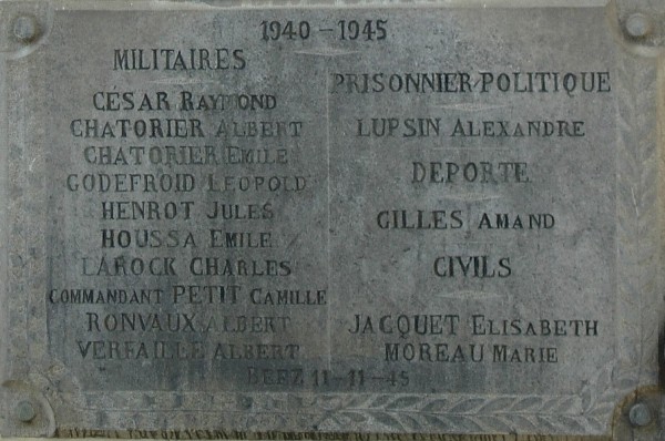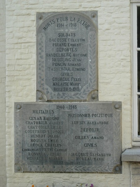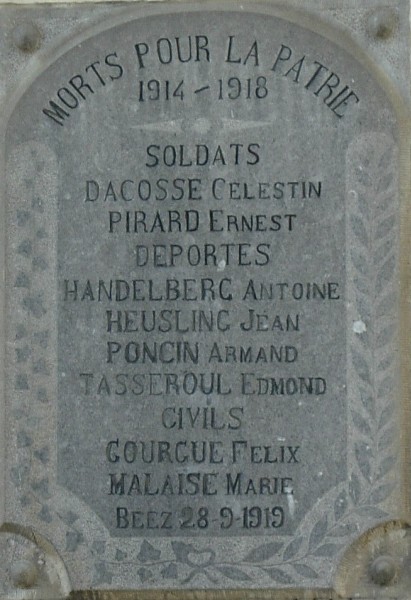 Localisation de ce monument: Sur le mur de l’école maternelle, Avenue Reine Elisabeth. Inscription figurant sur le monument "MORTS POUR LA PATRIE 1914-1918 SOLDATS [Deux noms, classés par ordre alphabétique] DÉPORTÉS [Quatre noms, classés par ordre alphabétique] CIVILS [Deux noms, classés par ordre alphabétique] BEEZ 28-9-1919 1940-1945 MILITAIRES [Dix noms classés par ordre alphabétique] PRISONNIER POLITIQUE [Un nom] DÉPORTÉ [Un nom] CIVILS [Deux noms, classés par ordre alphabétique] BEEZ 11-11-1945" Voir les noms mentionnés sur ce monument |