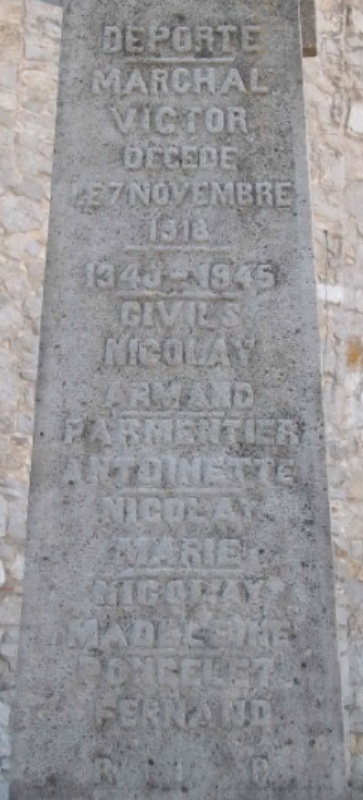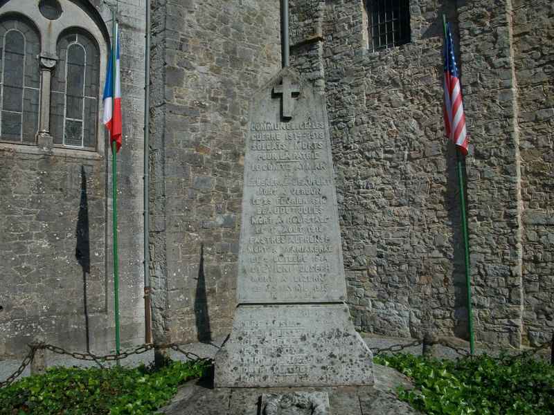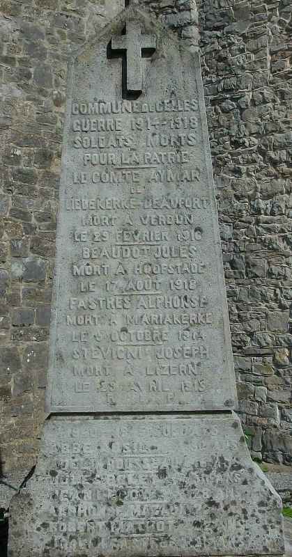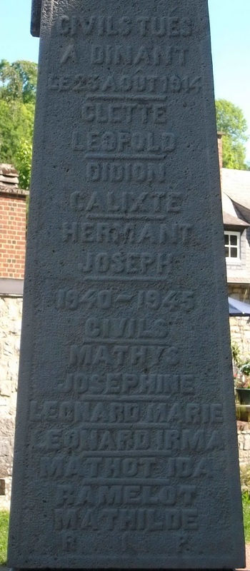 Localisation de ce monument: Rue Cachette au pied de l'église Saint-Hadelin. Coordonnées GPS : +50°13'44.51", + 5°00'29.09". Inscriptions figurant sur le monument Face avant "COMMUNE DE CELLES GUERRE 1914-1918 SOLDATS MORTS POUR LA PATRIE [Quatre noms, non classés par ordre alphabétique, avec mention du lieu et de la date de décès] R.I.P. 1940-1945 SOLDATS [Sept noms, très difficilement lisibles, avec mention de l'âge au décès]" Face droite "DÉPORTÉ [Un nom avec mention de la date de décès] 1940-1945 CIVILS [Cinq noms, non classés par ordre alphabétique] R.I.P." Face gauche "CIVILS TUÉS À DINANT LE 23 AOÛT 1914 [Trois noms, classés par ordre alphabétique] 1940-1945 CIVILS [Cinq noms, non classés par ordre alphabétique] R.I.P." Voir les noms mentionnés sur ce monument |