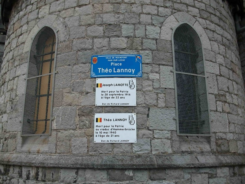 Localisation de ces plaques: À l'arrière de l'église, Place Théo LANNOY. Coordonnées GPS: +50°07'31.62", +5°11'16.02". Inscription figurant sur les plaques "JOSEPH LAMOTTE MORT POUR LA PATRIE LE 28 SEPTEMBRE 1914 À L'ÂGE DE 22 ANS DON DE RICHARD LANNOY" "THÉO LANNOY MORT POUR LA PATRIE AU VIADUC D'HAMMERBRÜCKE LE 10 MAI 1940 À L'ÂGE DE 21 ANS DON DE RICHARD LANNOY" Plus d'informations concernant ces personnes |