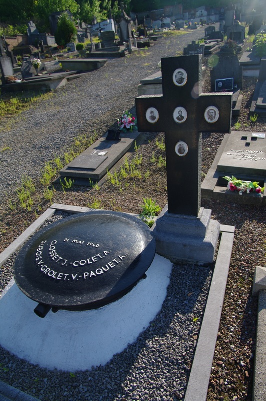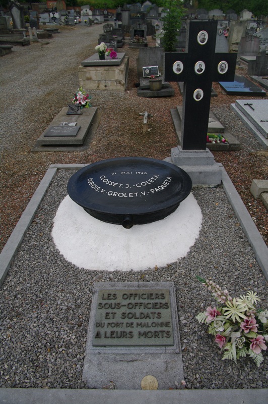 Localisation de ce monument: Rue du Tombois, dans le cimetière communal. Coordonnées GPS : +50°26'16.80", +4°47'38.00" Inscriptions figurant sur le monument Sur la croix "[Cinq photos non identifiées]" Sur la partie métallique "21 MAI 1940 [Cinq noms, classés par ordre alphabétique]" Sur la plaque à l'avant du monument "LES OFFICIERS SOUS-OFFICIERS ET SOLDATS DU FORT DE MALONNE À LEURS MORTS" Informations complémentaires concernant le fort de Malonne: Wikipédia - Fort de Malonne Fortiff - Fort de Malonne Namur hier, Namur aujourd'hui - Le fort de Malonne photographié par un soldat allemand en Mai 40 Voir les noms mentionnés sur ce monument |