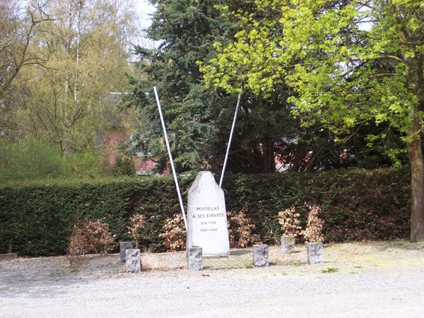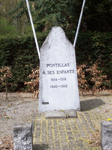 Localisation de ce monument: Au coin des rues de l'Église et de Namur. Coordonnées GPS: +50°32'49.64", +5°01'20.10". Inscription figurant sur le monument "PONTILLAS À SES ENFANTS 1914 - 1918 1940 - 1945" Ce monument ne comporte pas de noms |