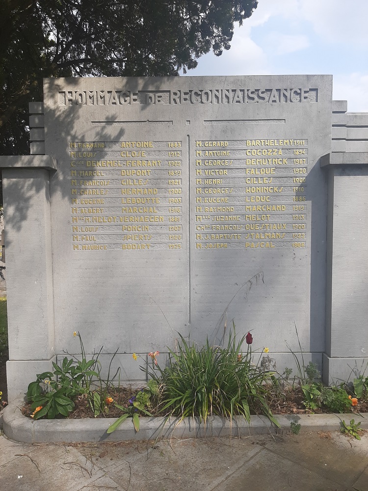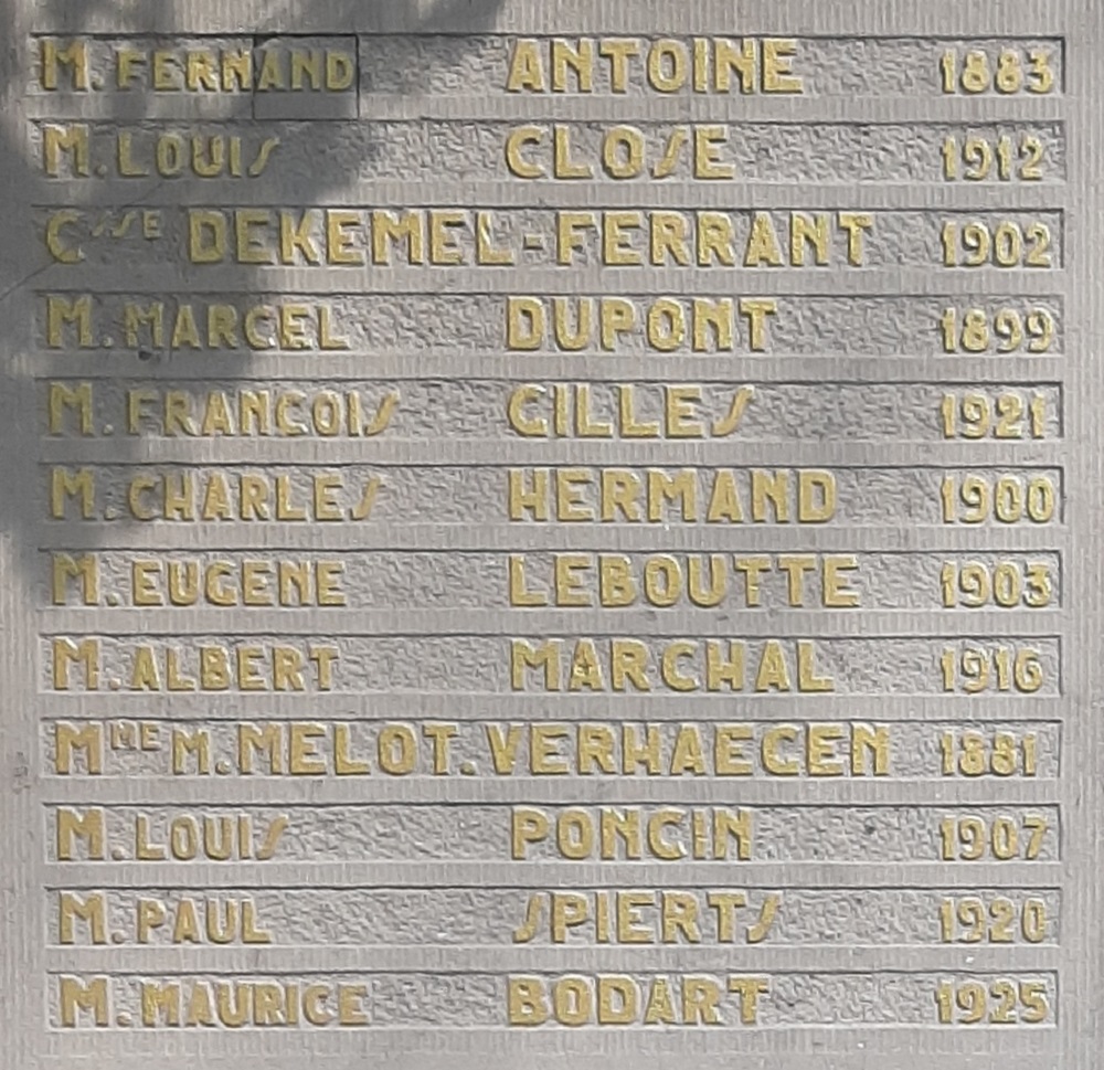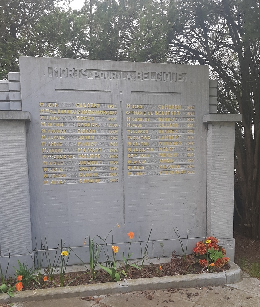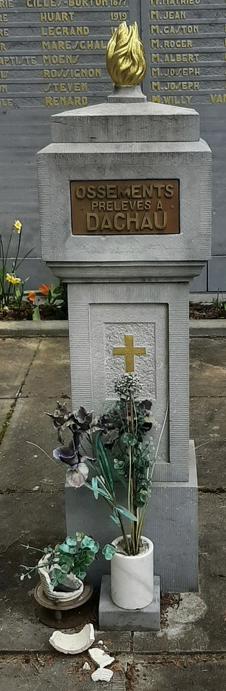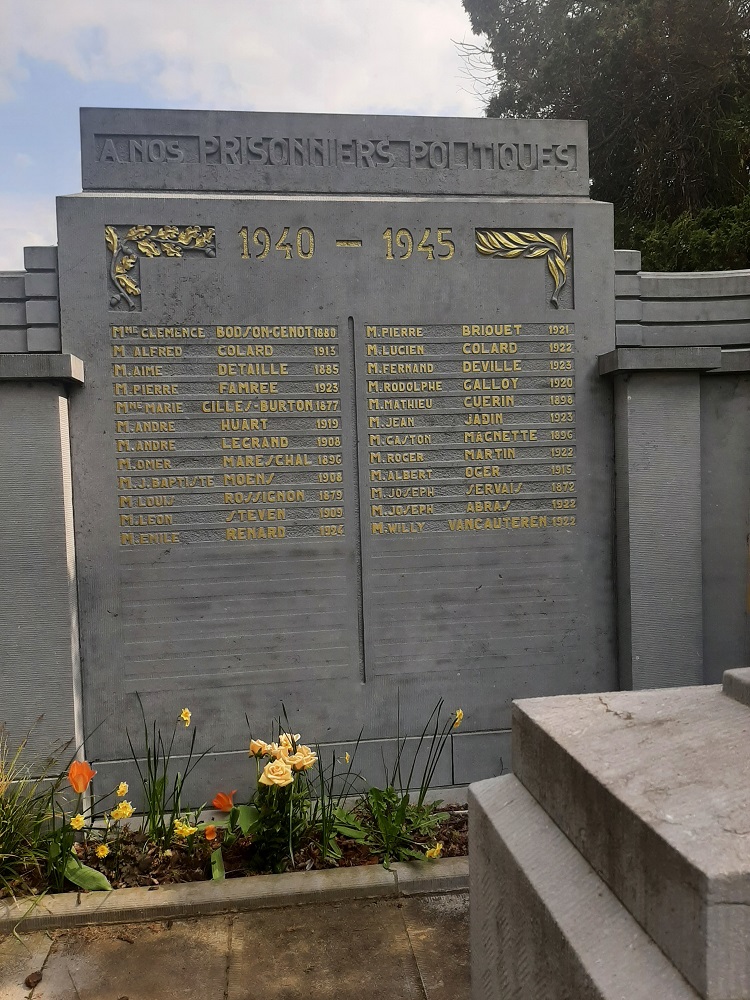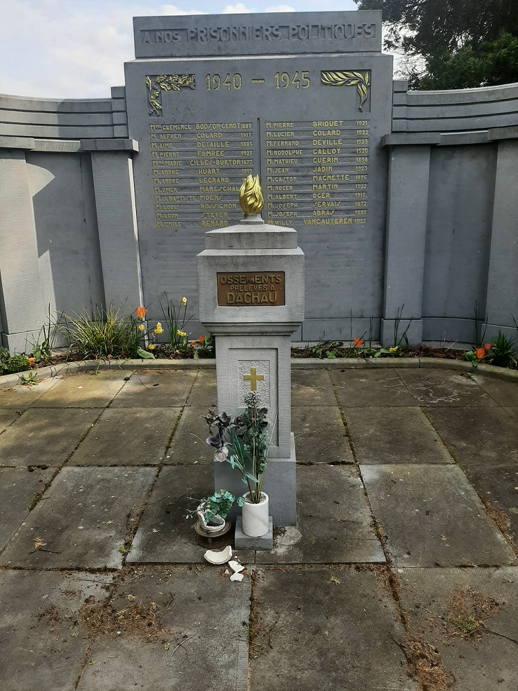 Localisation: Cimetière de Namur, Chaussée de Waterloo, 356 à Saint-Servais. Coordonnées GPS: +50° 28' 27.67", +4° 50' 01.22". Inscriptions sur le monument Panneau gauche "HOMMAGE DE RECONNAISSANCE [Vingt-quatre noms avec mention de l'année de naissance, rangés sur deux colonnes, classés par ordre alphabétique en deux séries]" Panneau central "À NOS PRISONNIERS POLITIQUES 1940 - 1945 [Vingt-quatre noms avec mention de l'année de naissance, rangés sur deux colonnes, classés par ordre alphabétique en trois séries]" Panneau droit "MORTS POUR LA BELGIQUE [Vingt-cinq noms avec mention de l'année de naissance, rangés sur deux colonnes, la plupart classés par ordre alphabétique en deux séries]" Urne centrale "OSSEMENTS PRÉLEVÉS À DACHAU" Voir les noms gravés sur ce monument |