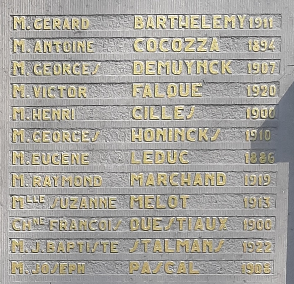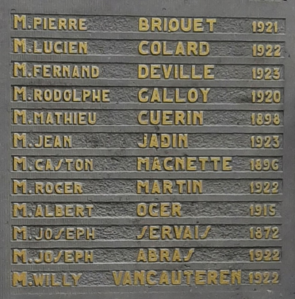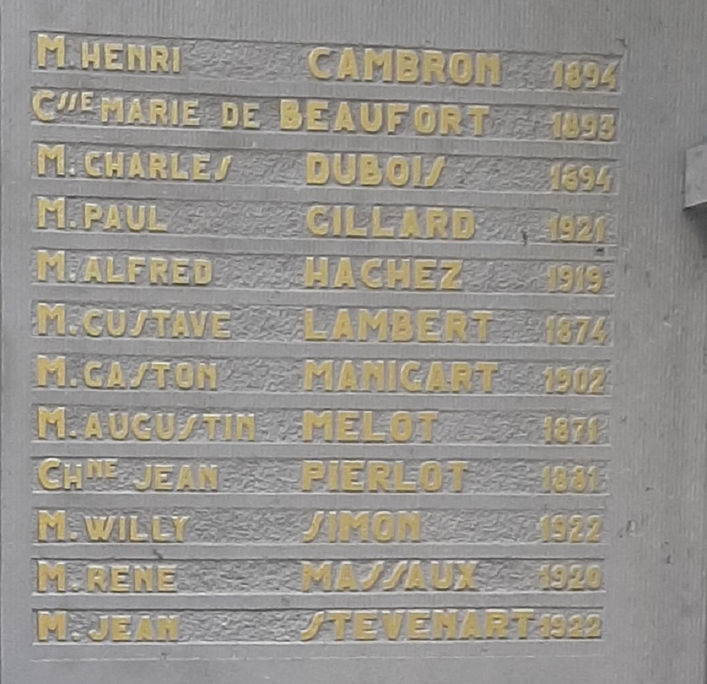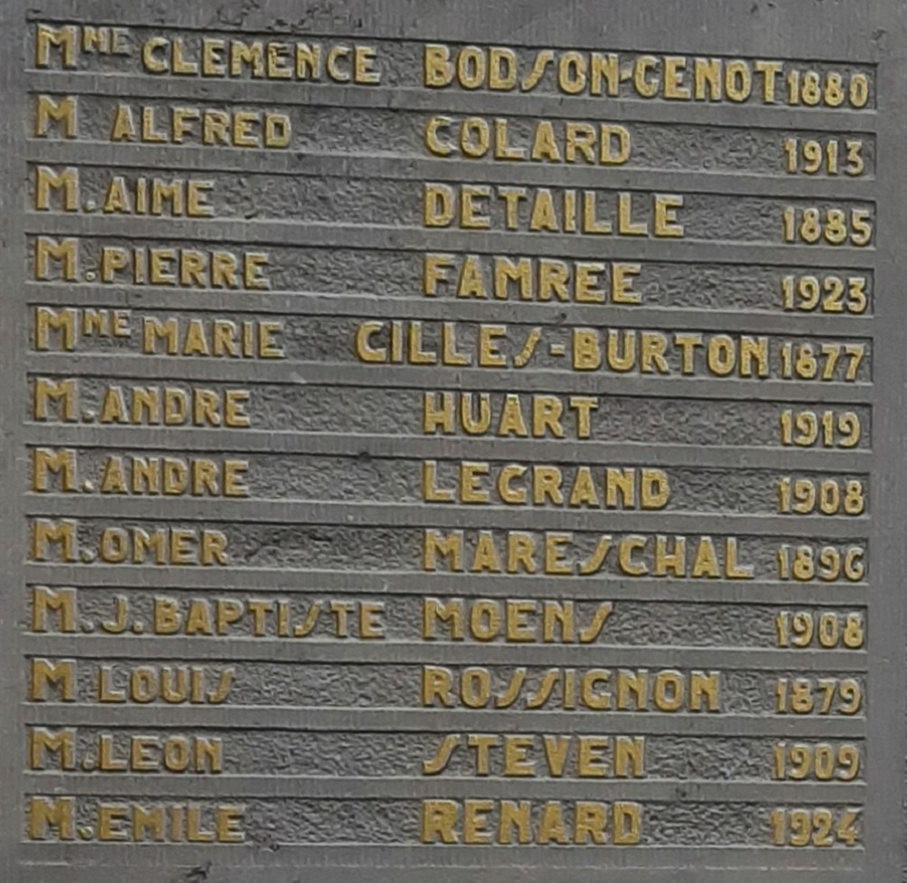 Localisation: Cimetière de Namur, Chaussée de Waterloo, 356 à Saint-Servais. Coordonnées GPS: +50° 28' 27.67", +4° 50' 01.22". Inscriptions sur le monument Panneau gauche "HOMMAGE DE RECONNAISSANCE [Vingt-quatre noms avec mention de l'année de naissance, rangés sur deux colonnes, classés par ordre alphabétique en deux séries]" Panneau central "À NOS PRISONNIERS POLITIQUES 1940 - 1945 [Vingt-quatre noms avec mention de l'année de naissance, rangés sur deux colonnes, classés par ordre alphabétique en trois séries]" Panneau droit "MORTS POUR LA BELGIQUE [Vingt-cinq noms avec mention de l'année de naissance, rangés sur deux colonnes, la plupart classés par ordre alphabétique en deux séries]" Urne centrale "OSSEMENTS PRÉLEVÉS À DACHAU" Voir les noms gravés sur ce monument |
