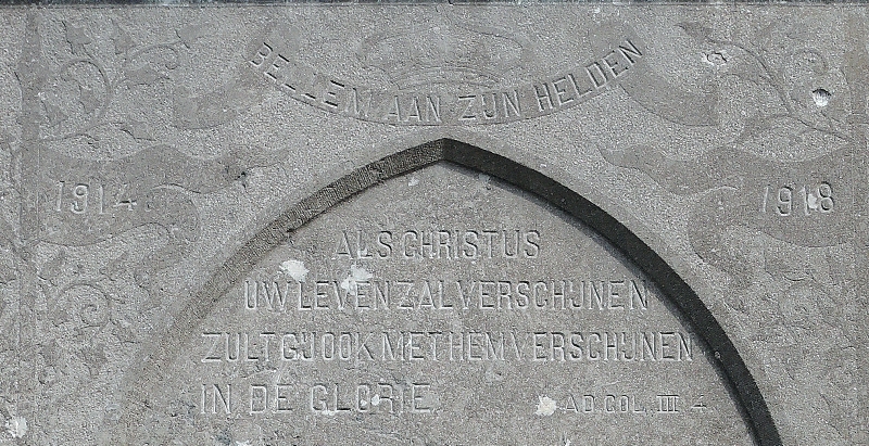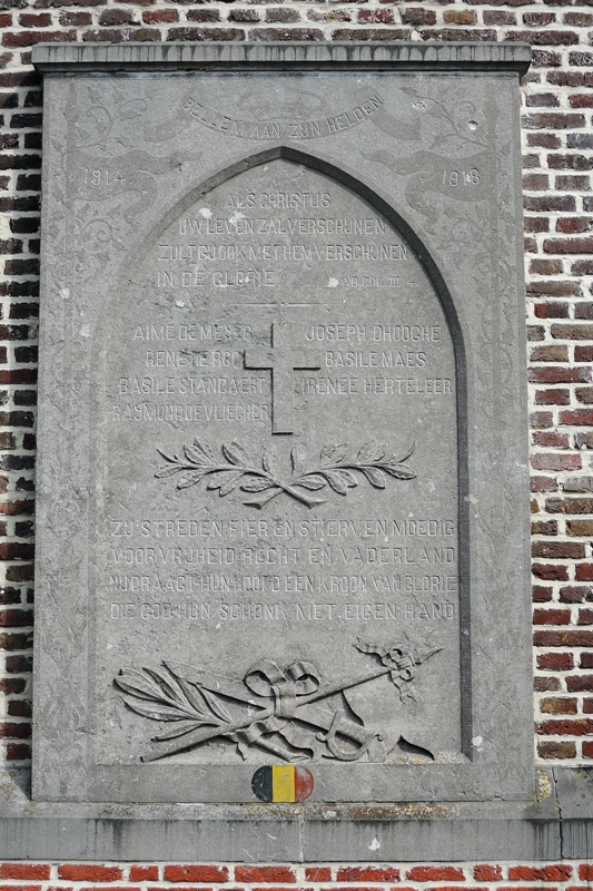 Situering: Gevel Onze-Lieve-Vrouw-Geboortekerk, hoek Mariahovelaan en Lotenhullestraat. GPS-coördinaten: +51°4'52.9", +3°30'47.5" Opschriften "1914 - BELLEM AAN ZIJN HELDEN - 1918 ALS CHRISTUS UW LEVEN ZAL VERSCHIJNEN ZULT GIJ OOK MET HEM VERSCHIJNEN IN DE GLORIE A.D. COL. III 4 [Zeven namen, niet alfabetisch gerangschikt] ZIJ STREDEN FIER EN STIERVEN MOEDIG VOOR VRIJHEID, RECHT EN VADERLAND NU DRAAGT HUN HOOFD EEN KROON VAN GLORIE DIE GOD HUN SCHONK MET EIGEN HAND" Zie namen gebeiteld op het gedenksteen |