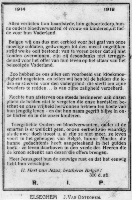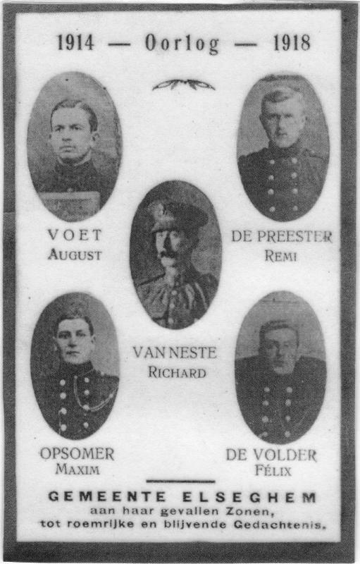 Situering: Collectie heemkundige kring Bouveloo. Opschriften Voorkant "1914 - OORLOG - 1918 [Vijf namen, niet alfabetisch gerangschikt, met foto's] GEMEENTE ELSEGHEM AAN HAAR GEVALLEN ZONEN, TOT ROEMRIJKE EN BLIJVENDE GEDACHTENIS." Achterkant Zie scan onderaan Zie namen vermeld op het document |