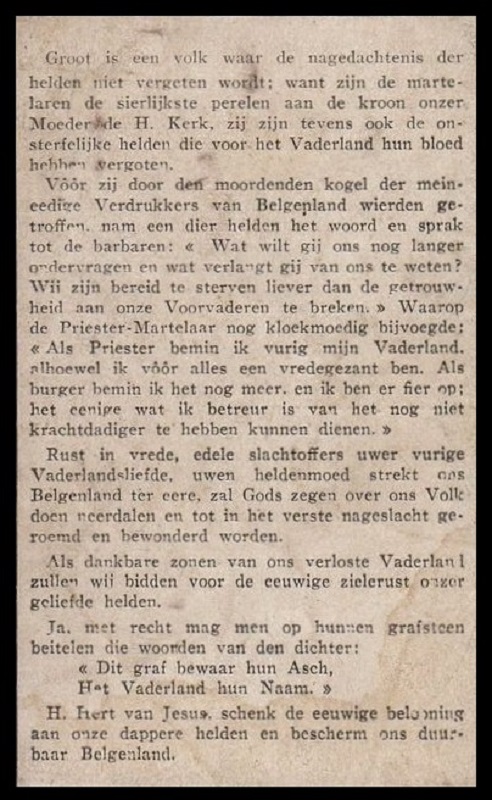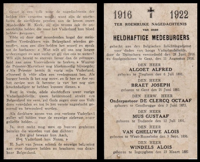 Situering: Privécollectie. Opschriften Voorkant "[Zes namen, niet alfabetisch gerangschikt, met foto's]" Achterkant "1916 - 1922 TER ROEMRIJKE NAGEDACHTENIS VAN ONZE HELDHAFTIGE MEDEBURGERS GEHECHT AAN DEN BELGISCHEN INLICHTINGSDIENST VOOR DADEN VAN HOOGE VADELANDSLIEFDE, DOOR DE DUITSCHERS VEROORDEELD DEN 28 JUNI 1916 EN DOODGESCHOTEN TE GENT, DEN 11 AUGUSTUS 1916. [Zes namen, alfabetisch gerangschikt, met vermelding van geboorteplaats en -datum]" Zie ook scan onderaan. Zie namen vermeld op deze doodsprentje |