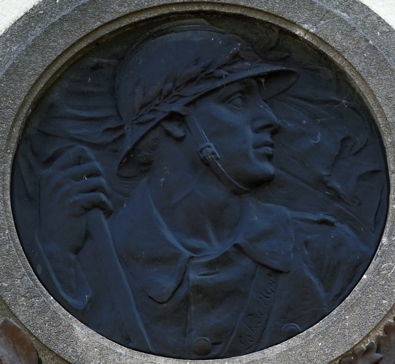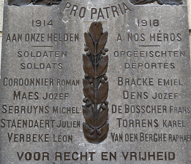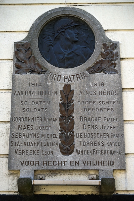 Situering: Rodekoningstraat. GPS-coördinaten: +51°03'28.5", +3°43'25.4" Opschriften "PRO PATRIA 1914 - 1918 AAN ONZE HELDEN - À NOS HÉROS SOLDATEN SOLDATS [Vijf namen, alfabetisch gerangschikt] OPGEEISCHTEN DÉPORTÉS [Vijf namen, alfabetisch gerangschikt] VOOR RECHT EN VRIJHEID" Beeldhouwer: Hypp. LE ROY (gesigneerd). Zie namen gebeiteld op de gedenkplaat |
