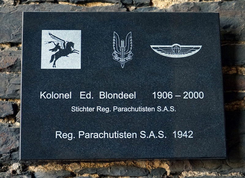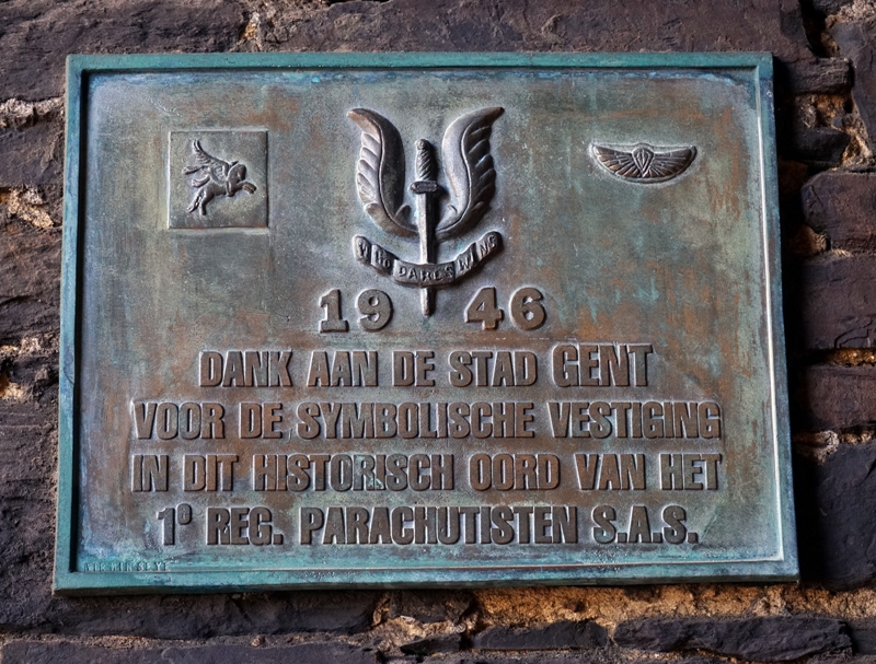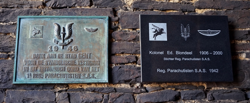 Situering: Gravensteen, ingangspoort, hoek Rekelingestraat/Geldmunt, binnen in de inkom, rechterkant. GPS-coördinaten: +51°03'25.2", +3°43'15.8" Opschriften Linkerplaat "WHO DARES WINS 1946 DANK AAN DE STAD GENT VOOR DE SYMBOLISCHE VESTIGING IN DIT HISTORISCH OORD VAN HET 1E REG. PARACHUTISTEN S.A.S." Rechterplaat "WHO DARES WINS KOLONEL Ed. BLONDEEL 1906 - 2000 STICHTER REG. PARACHUTISTEN S.A.S. REG. PARACHUTISTEN S.A.S. 1942" Er staan geen namen van oorlogsslachtoffers gebeiteld op de gedenkplaten |