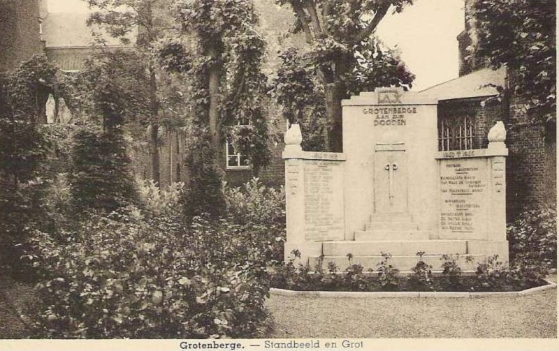 Ligging : Ten oosten van de kerk, aan de Grotstraat. GPS-coördinaten: +50°52'21.8", +3°49'58.5" Opschriften "PAX GROTENBERGE AAN ZIJN DOODEN" Geschiedenis Na de oorlog 40/45 werd in Grotenberge ten oosten van de kerk, aan de Grotstraat, een ereperk met een monument voor de slachtoffers van de beide wereldoorlogen opgericht. Op 21 maart 1948 wordt, bij geheime stemming, gekozen tussen de ingediende ontwerpen. In een eerste ronde werd gestemd voor de “eerste prijs”, waarbij Aimé de Martelaere het haalt met 11 stemmen op 16. Voor de “tweede prijs” haalt de firma Waterlot-Mary het met 9 stemmen ; de firma Deweerdt kaapt de derde prijs weg met 9 stemmen. Vervolgens wordt er gestemd over de namen die op het monument dienen gekapt : Emiel De Vuyst dient bijgevoegd aan de lijst van WO I en voor de Tweede Wereldoorog moeten 7 slachtoffers vermeld worden. Aimé De Martelaere krijgt dus de opdracht toegewezen, maar de uitvoering wordt alsmaar verdaagd. (Bron: "Oorlogsmonumenten te Zottegem") Inhuldiging: 6 mei 1951. Zie namen op het monument |