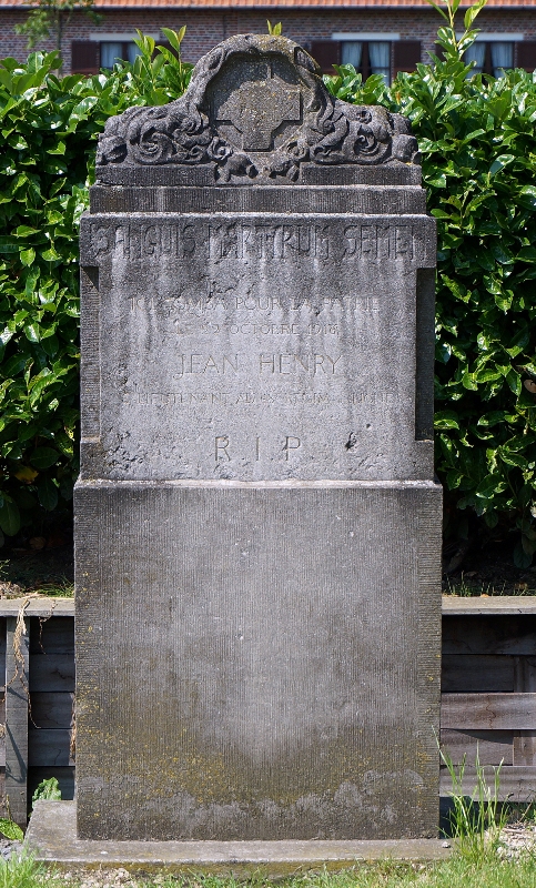 Situering: Warandestraat (vroeger: Veldstraat), ter hoogte van nr 22. GPS-coördinaten: +51°04'57.8", +3°31'19.5" Opschriften "SANGUIS MARTYRUM SEMEN [Vertaling: Het bloed der martelaren is zaad] ICI TOMBA POUR LA PATRIE LE 22 OCTOBRE 1918 JEAN HENRY S-LIEUTENANT AU 18E REGMT LIGNE R.I.P." Meer info over deze gesneuvelde |