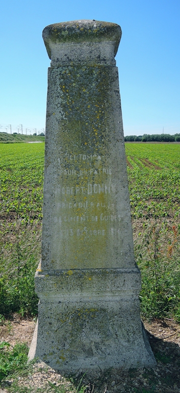 Situering: Hansbekestraat, langs de vaart, dicht bij spoorwegbrug (lijn Gent - Oostende). GPS-coördinaten: +51°03'59.6", +3°34'15.4" Opschriften "ICI TOMBA POUR LA PATRIE ROBERT DONNY BRIGADIER AU IE RÉGIMENT DE GUIDES LE 13 OCTOBRE 1914" Vertaling Hier sneuvelde voor het Vaderland Robert DONNY, Brigadier bij het 1ste Regiment Gidsen, op 13 oktober 1914. Beschrijving Er is een afbeelding van een palmtak, een sabel en een gidsenmuts in het monument verwerkt (Bron [231]) . Meer info over deze gesneuvelde |
