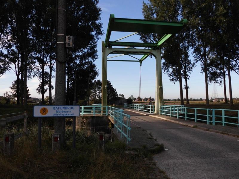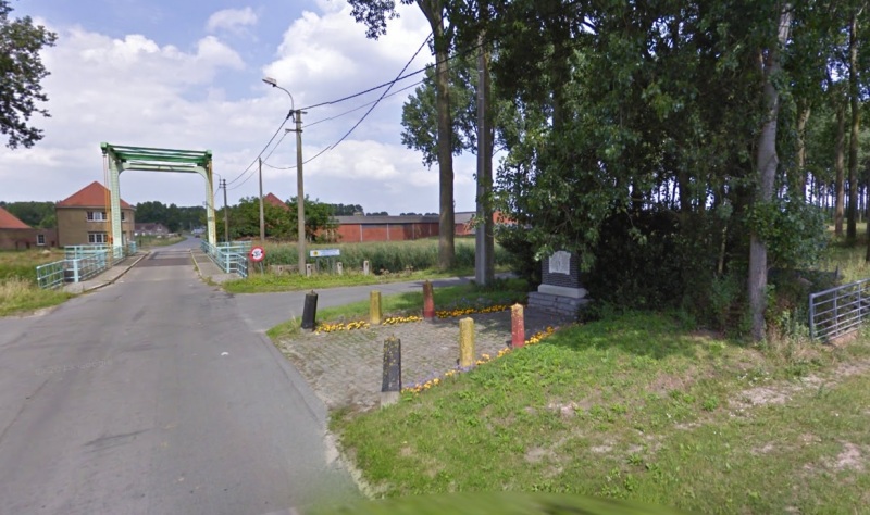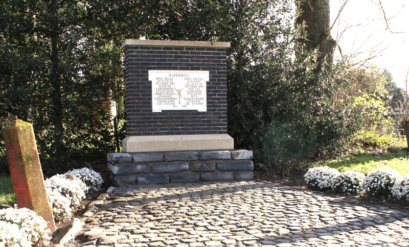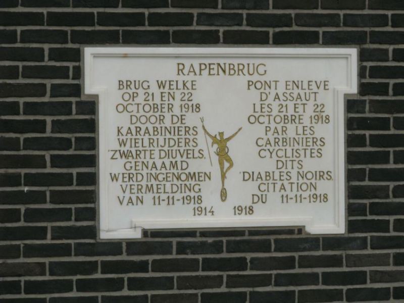 Situering: Rapenbrug, langs Schipdonkkanaal, kruising Moerhuizestraat, Aardenburgkalseide en Rapenbrugstraat Noord. GPS-coördinaten: +51°13'52.2", +3°27'29.1" Opschriften "RAPENBRUG BRUG WELKE OP 21 EN 22 OCTOBER 1918 DOOR DE KARABINIERS WIELRIJDERS, ZWARTE DUIVELS GENAAMD, WERD INGENOMEN VERMELDING VAN 11-11-1918 PONT ENLEVÉ D'ASSAUT LES 21 ET 22 OCTOBRE 1918 PAR LES CAR(A)BINIERS CYCLISTES DITS DIABLES NOIRS CITATION DU 11-11-1918 1914 - 1918" Beschrijving Gedenkteken ter ere voor het maken en heldhaftig verdedigen van een bruggenhoofd op 21 en 22 oktober 1918 door de Belgische karabiniers wielrijders genaamd de "Zwarte Duivels" (Bron: Maldegem in den Grooten Oorlog). De Rapenbrug over het Schipdonkkanaal werd vernield in 1918. Een tweede vernieling volgde tijdens de Tweede Wereldoorlog. De huidige brug is een ijzeren ophaalbrug, wederopgebouwd in 1947 samen met de verderop gelegen Celiebrug in Adegem (Bron [100]). Er staan geen namen gebeiteld op het gedenksteen - Ce monument ne comporte pas de noms |