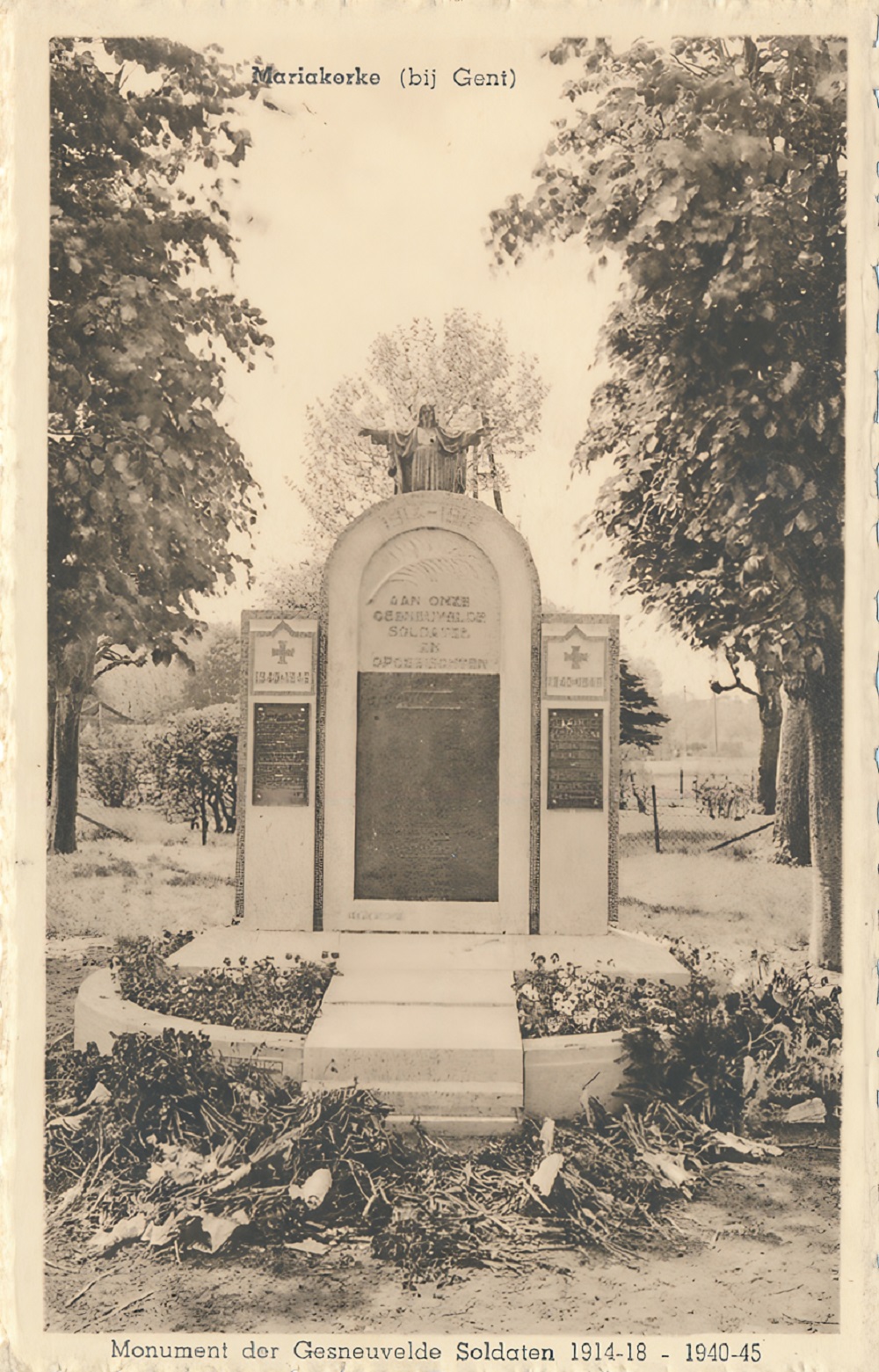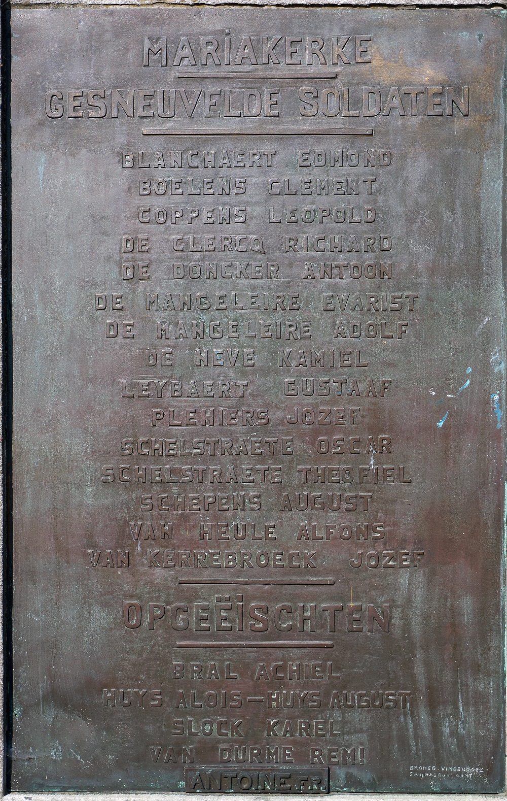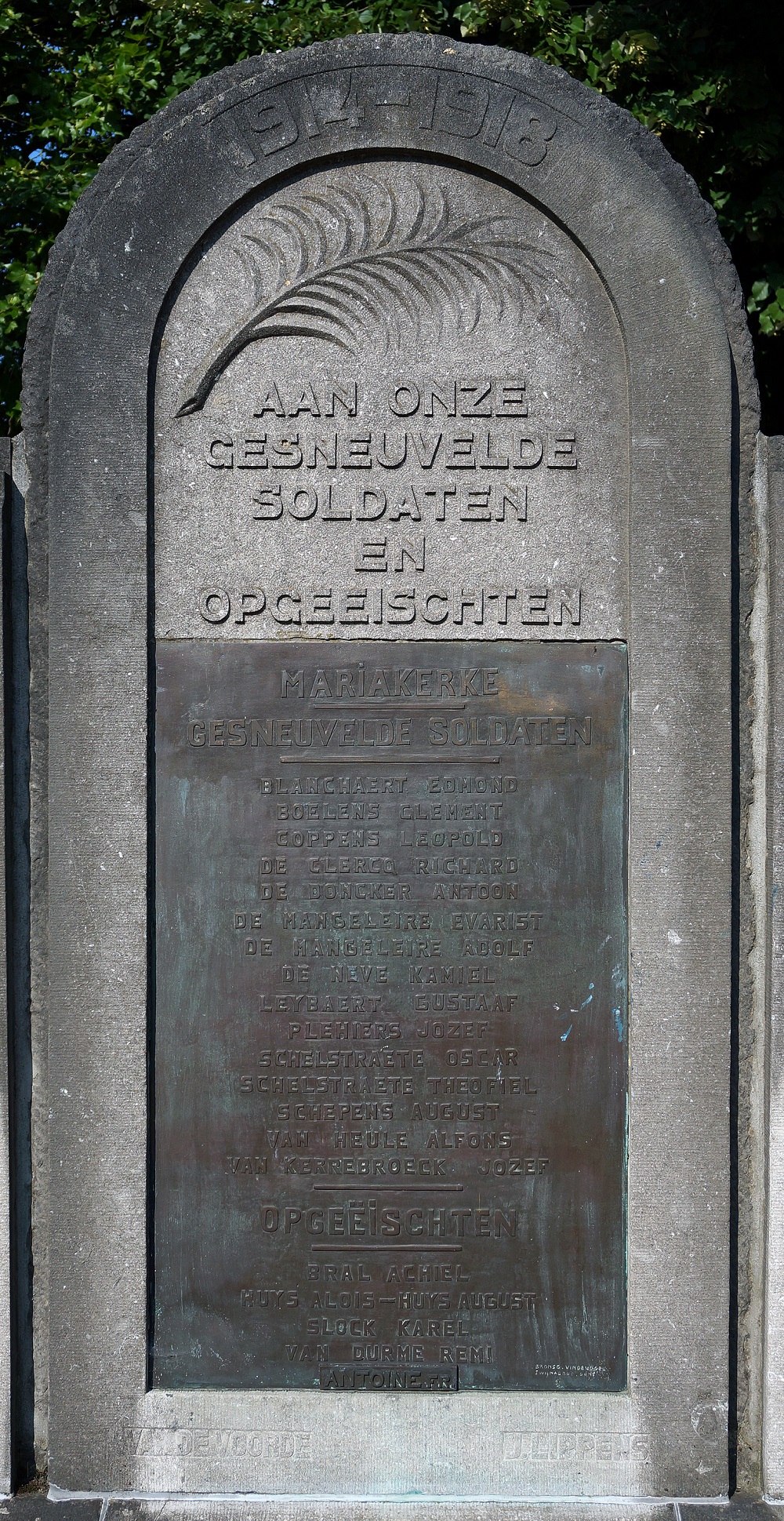 Ligging: Mariakerkeplein, voor de kerk. GPS-coördinaten: +51°04'22.1", +3°40'32.4" Opschriften Middenplaat "1914-1918 AAN ONZE GESNEUVELDE SOLDATEN EN OPGEËISCHTEN MARIAKERKE GESNEUVELDE SOLDATEN [Vijftien namen, alfabetisch gerangschikt] OPGEËISCHTEN [Vijf namen, alfabetisch gerangschikt, met één uitzondering]" Linkerplaat "1940-1945 GESNEUVELDE SOLDATEN [Twee namen, niet alfabetisch gerangschikt] BURG. BESCH. D. [Één naam]" Rechterplaat "POLITIEKE GEVANGENEN [Vier namen, alfabetisch gerangschikt]" Uitvoering: Bronsg. VINDEVOGEL, Swijnaerde, Gent (gesigneerd). Zie namen op het gedenksteen |