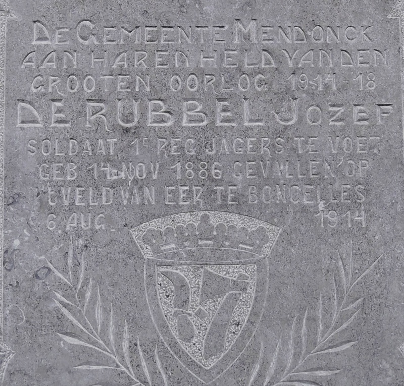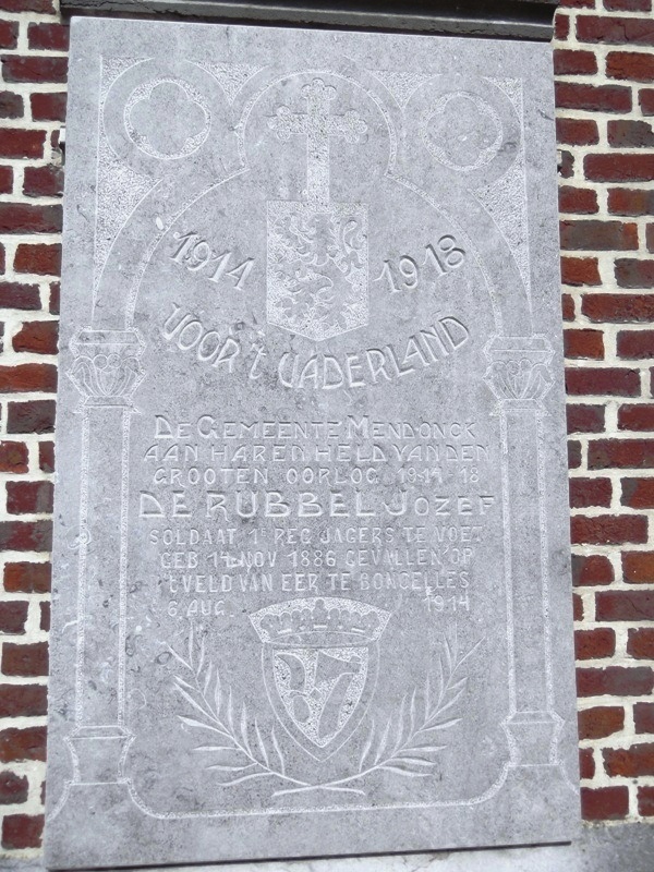 Situering: Gevel van de Sint-Baafskerk, Mendonkdorp. GPS-coördinaten: +51°08'49.2", +3°49'17.6" Opschriften "1914 - 1918 VOOR 'T VADERLAND DE GEMEENTE MENDONCK AAN HAREN HELD VAN DEN GROOTEN OORLOG 1914-18 DE RUBBEL JOZEF SOLDAAT 1E REG. JAGERS TE VOET GEB. 14 NOV. 1886 GEVALLEN OP 'T VELD VAN EER TE BONCELLES 6 AUG. 1914" Meer info over deze gesneuvelde |