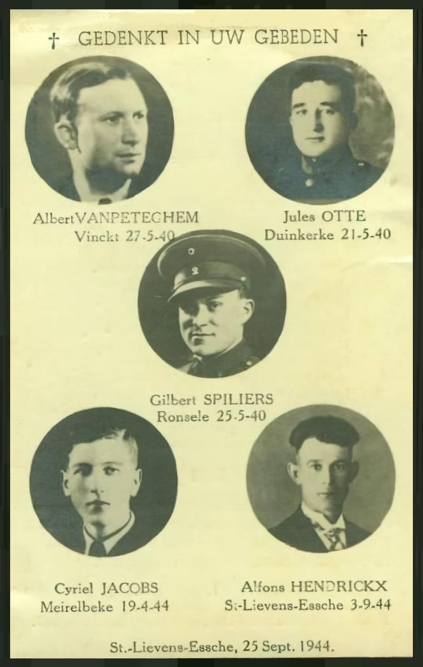 Ligging: Private collectie. Opschriften "GEDENKT IN UW GEBEDEN [Vijf namen, niet alfabetisch gerangschikt, met foto's en vermelding van overlijdensplaats en -datum] ST.-LIEVENS-ESSCHE, 25 SEPT. 1944." Zie namen vermeld op het bidprent |