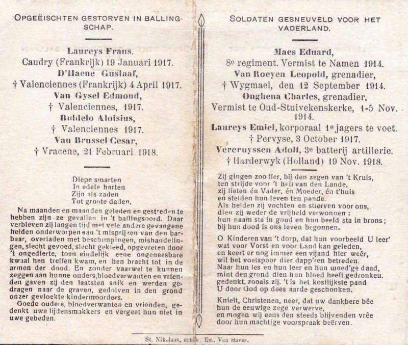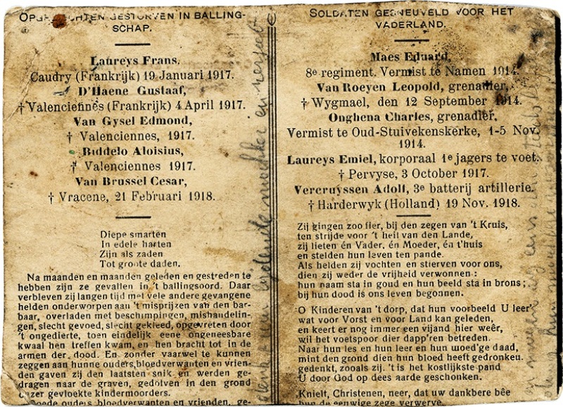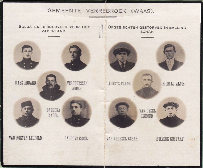 Situering: Privatcollecties bronnen [38] en [217]. Opschriften Ommezijde "GEMEENTE VERREBROEK (WAAS) SOLDATEN GESNEUVELD VOOR HET VADERLAND [Vijf namen, niet alfabetisch gerangschikt, met foto's] OPGEËISCHTEN GESTORVEN IN BALLING- SCHAP [Vijf namen, niet alfabetisch gerangschikt, met foto's]" Keerzijde "OPGEËISCHTEN GESTORVEN IN BALLING- SCHAP [Vijf namen, gerangschikt naar overlijdensdatum, met vermelding van overlijdensplaats en -datum] [Zie ook scans beneden] SOLDATEN GESNEUVELD VOOR HET VADERLAND [Vijf namen, gerangschikt naar overlijdensdatum, met vermelding van overlijdensplaats en -datum] [Zie ook scans beneden]" Zie namen vermeld op het document |
