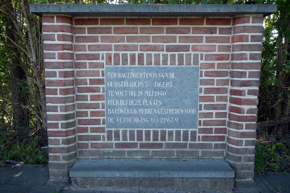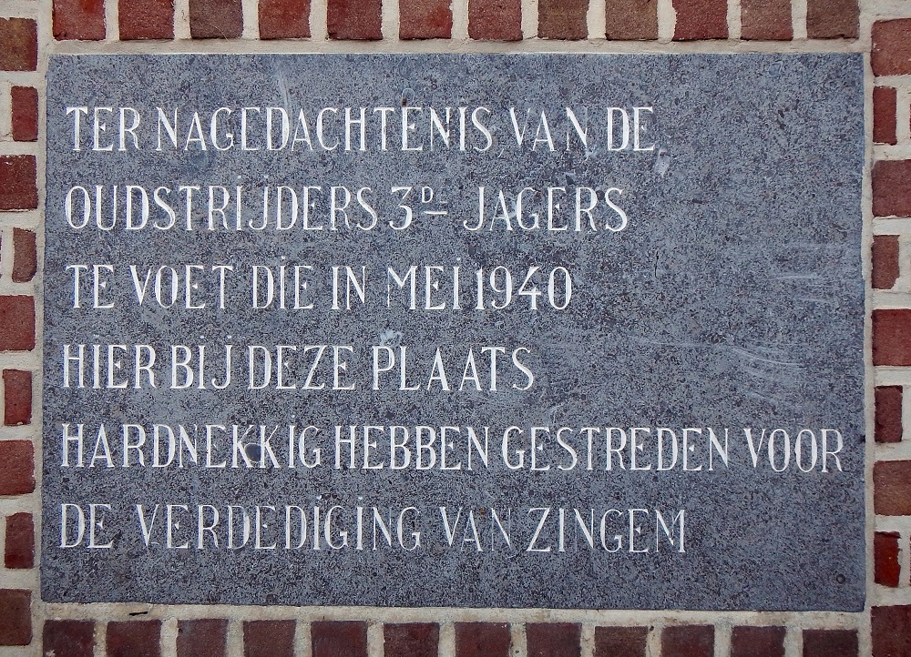 Situering - Localisation: Nederzwalmsesteenweg, brug over de Schelde. Nederzwalmsesteenweg, à hauteur du pont sur l'Escaut. GPS-coördinaten - Coordonnées GPS: +50°53'37.2", +3°40'44.1" Opschriften "TER NAGEDACHTENIS VAN DE OUDSTRIJDERS 3DE JAGERS TE VOET DIE IN MEI 1940 HIER BIJ DEZE PLAATS HARDNEKKIG HEBBEN GESTREDEN VOOR DE VERDEDIGING VAN ZINGEM" Er staan geen namen gebeiteld op het gedenksteen |