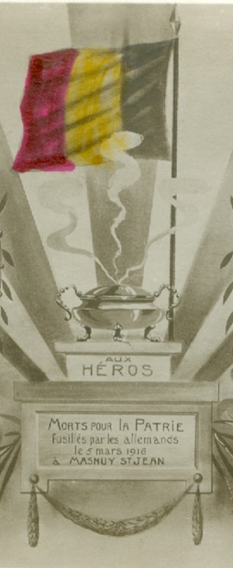 Situering: Privécollectie. Opschriften "AUX HÉROS [Twee namen, met foto] MORTS POUR LA PATRIE FUSILLÉS PAR LES ALLEMANDS LE 5 MARS 1916 À MASNUY-ST-JEAN" Zie ook scan beneden Zie namen vermeld op het memento |