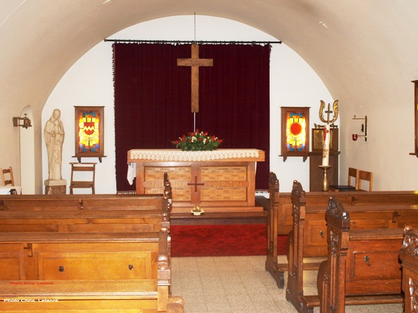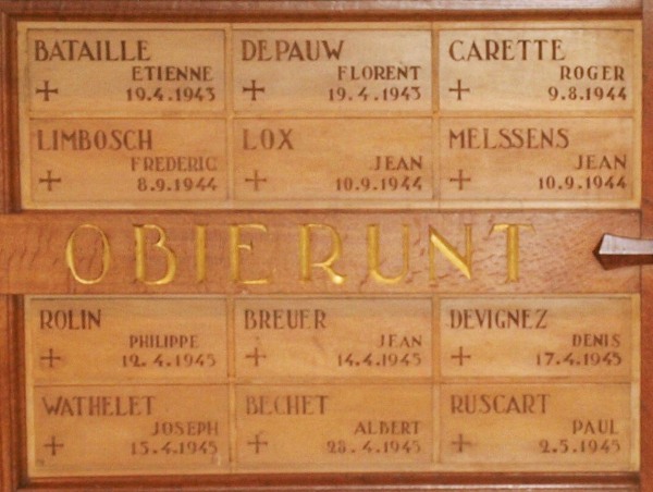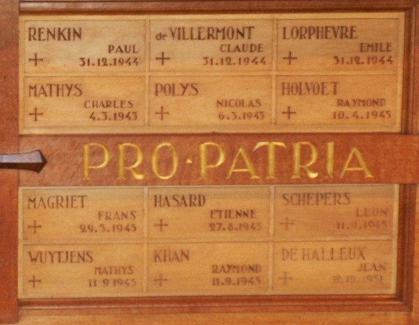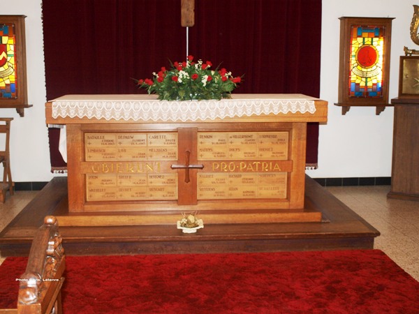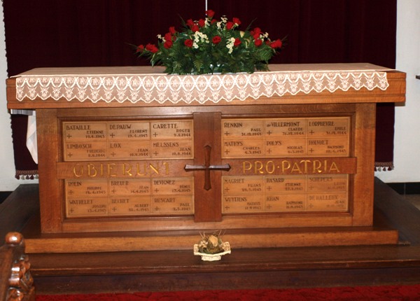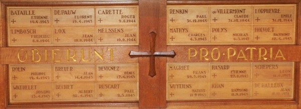 Situering: Citadel, kapel kwartier Luitenant Freddy LIMBOSCH (Eerste Bataljon Parachutisten). GPS-coördinaten: +50°59'00.78", +5°02'42.17". Opschriften Altaar "[Vierentwintig namen, gerangschikt volgens overlijdensdatum] OBIERUNT PRO PATRIA [Zij sneuvelden voor het Vaderland]" Linker kerkraam "HOMMAGE DE RECONNAISSANCE LA COMMUNE DE GEDINNE" Rechter kerkraam "HOMMAGE DE RECONNAISSANCE LA COMMUNE DE BURE" Zie namen vermeld op het altaar |