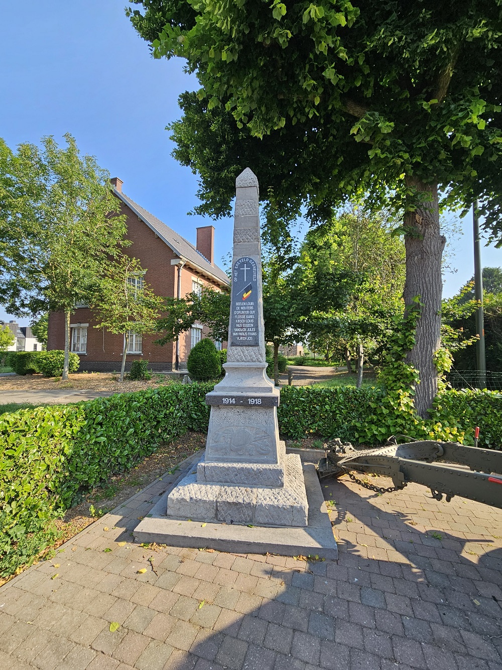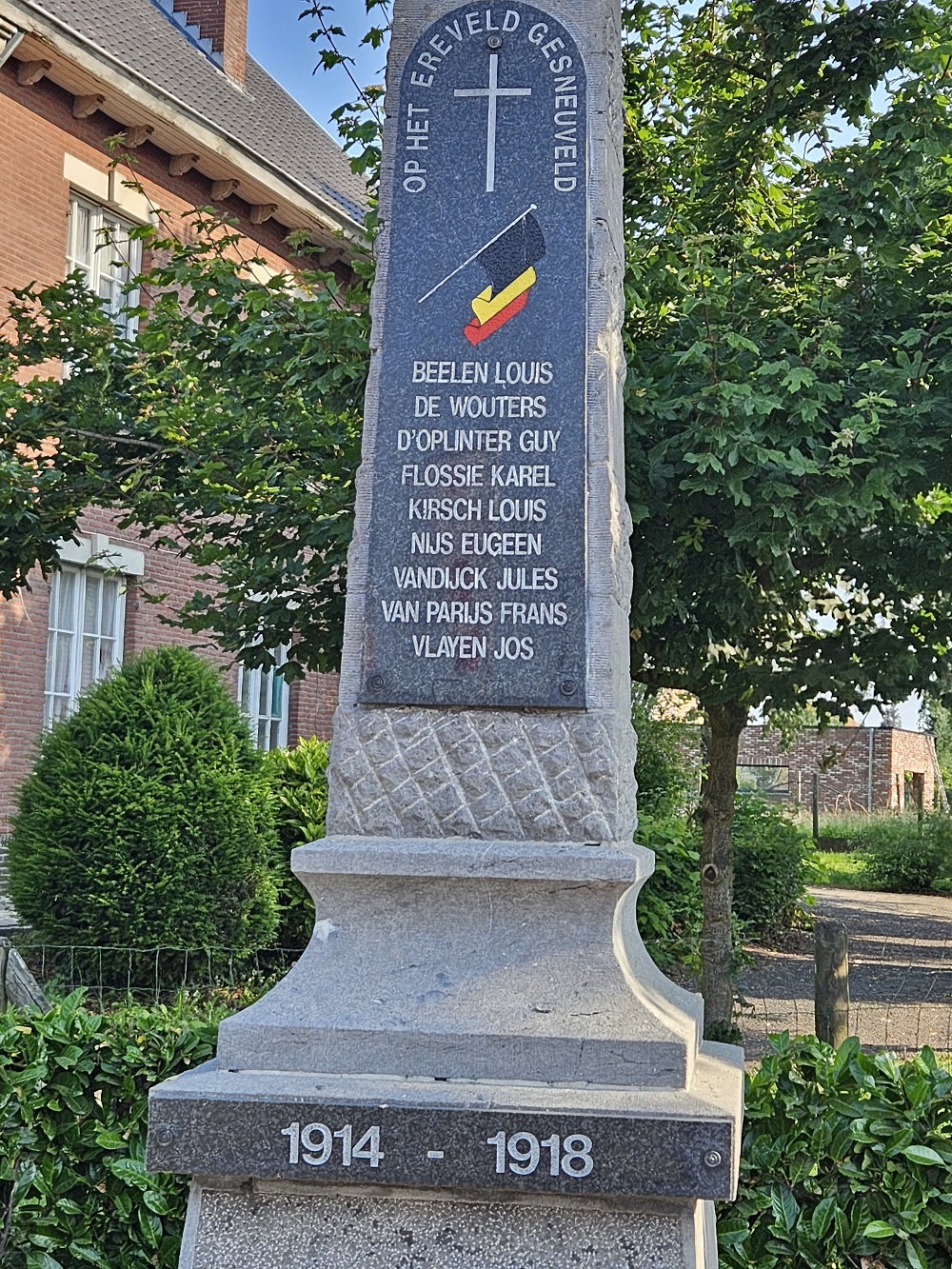 Ligging: Voor het gemeentehuis, Dorpsplein. GPS-coördinaten: +50°54'31.11", +5°3'43.33" Opschriften "OP HET EREVELD GESNEUVELD [Kruis] [Belgisch vlag] [Acht namen, alfabetisch gerangschikt] 1914 - 1918" Zie namen op het monument |