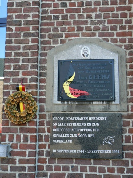 Situering: Voorgevel van het gemeentehuis, Dorpsplein. GPS-coördinaten: +50° 54' 31.11", +5° 3' 43.33". Opschriften op de platen Gedenkplaat voor Jozef GEENS "HET GEMEENTEBESTUUR VAN KORTENAKEN AAN BURGEMEESTER JOZEF GEENS VOORBEELD VAN BURGERDEUGD EN PLICHTBESEF GEVALLEN VOOR VOLK EN VADERLAND IN HET CONCENTRATIEKAMP VAN ELLRICH 6 JANUARI 1945" Herdenkingsplaat "50 jaar bevrijding" "GROOT-KORTENAKEN HERDENKT 50 JAAR BEVRIJDING EN ZIJN OORLOGSSCLACHTOFFERS DIE GEVALLEN ZIJN VOOR HET VADERLAND 10 SEPTEMBER 1944 - 10 SEPTEMBER 1994" Meer informatie over Jozef GEENS |