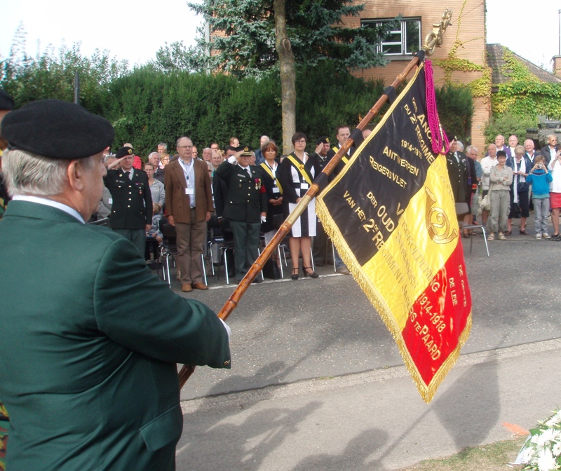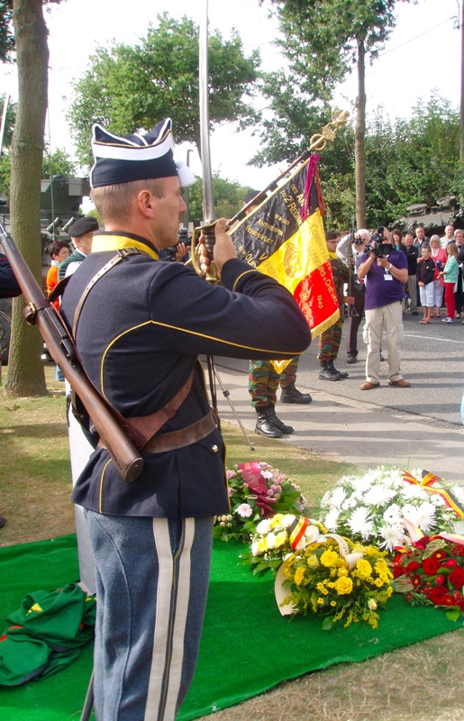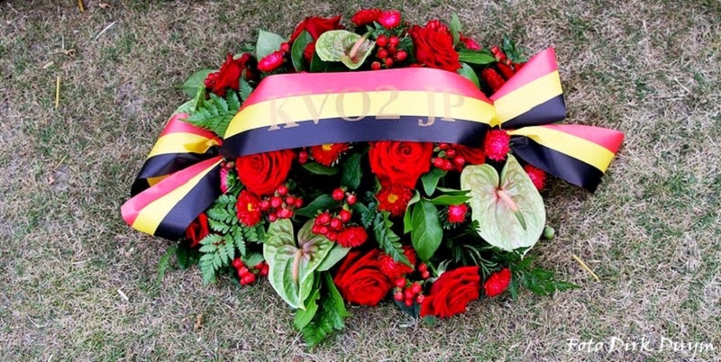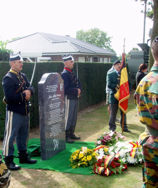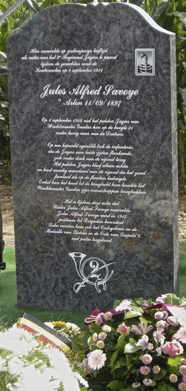 Situering: Kouter, ter hoogte van huisnummer nr 72, dichtbij Koutermolen. GPS-coördinaten: +50°58'31.21", +4°13'52.19" Opschriften op het gedenkteken "HIER SNEUVELDE OP ZESTIENJARIGE LEEFTIJD ALS RUITER VAN HET 2e REGIMENT JAGERS TE PAARD TIJDENS DE GEVECHTEN ROND DE KOUTERMOLEN OP 1 SEPTEMBER 1914 [Foto van Jules SAVOYE] JULES ALFRED SAVOYE ° ARLON 11/09/1897 OP 1 SEPTEMBER 1914 VIEL HET PELOTON JAGERS VAN WACHTMEESTER GAUTIER HIER OP DE HOOGDE 31 ONDER HEVIG VUUR VAN DE DUITSERS. OP EEN BEPAALD OGENBLIK TROK DE INFANTERIE, DIE DE JAGERS AAN BEIDE ZIJDEN FLANKEERDE, ZICH ONDER DRUK VAN DE VIJAND TERUG HET PELOTON JAGERS BLEEF ALLEEN ACHTER EN BEED MOEDIG WEERSTAND AAN DE VIJAND DIE HET ZOWEL FRONTAAL ALS OP DE FLANKEN BEDREIGDE. ENKEL TOEN HET BEVEL TOT DE TERUGTOCHT HEM BEREIKTE LIET WACHTMEESTER GAUTIER ZIJN MANSCHAPPEN TERUGTREKKEN. HET IS TIJDENS DEZE ACTIE DAT RUITER JULES ALFRED SAVOYE SNEUVELDE. JULES ALFRED SAVOYE WERD IN 1915 POSTUUM TOT BRIGADIER BEVORDERD LATER WERDEN HEM OOK HET OORLOGSKRUIS EN DE MEDAILLE VAN RIDDER IN DE ORDE VAN LEOPOLD II MET PALM TOEGEKEND. [Kenteken van het 2de Regiment Jagers te Paard]" Verdere informatie - Video van de onthulling - Verdere foto's gemaakt op de Dag van de Cavalerie Meer info over deze gesneuvelde |