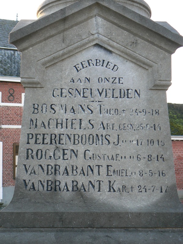 Situering: In het midden van de driehoek gevormd door de Ketelstraat, de Grote Baan en de Kraaistraat. GPS-coördinaten: +50° 53' 19.50", +5° 9' 57.20". Opschriften op het monument Voorkant "EERBIED AAN ONZE GESNEUVELDEN [Zes namen, alfabetisch gerangschikt, met vermelding van overlijdensdatum]" Zijkant 1 "ZIJ WILDEN WAT WAS RECHT [Tweeentwintig namen, alfabetisch gerangschikt]" Zijkant 2 "VOOR KONING VADERLAND EN HAARD [Tweeentwintig namen, alfabetisch gerangschikt]" Zijkant 3 "ZIJ WONNEN WAT ZIJ WILDEN [Drieentwintig namen, alfabetisch gerangschikt]" Zie namen gebeiteld op het monument |